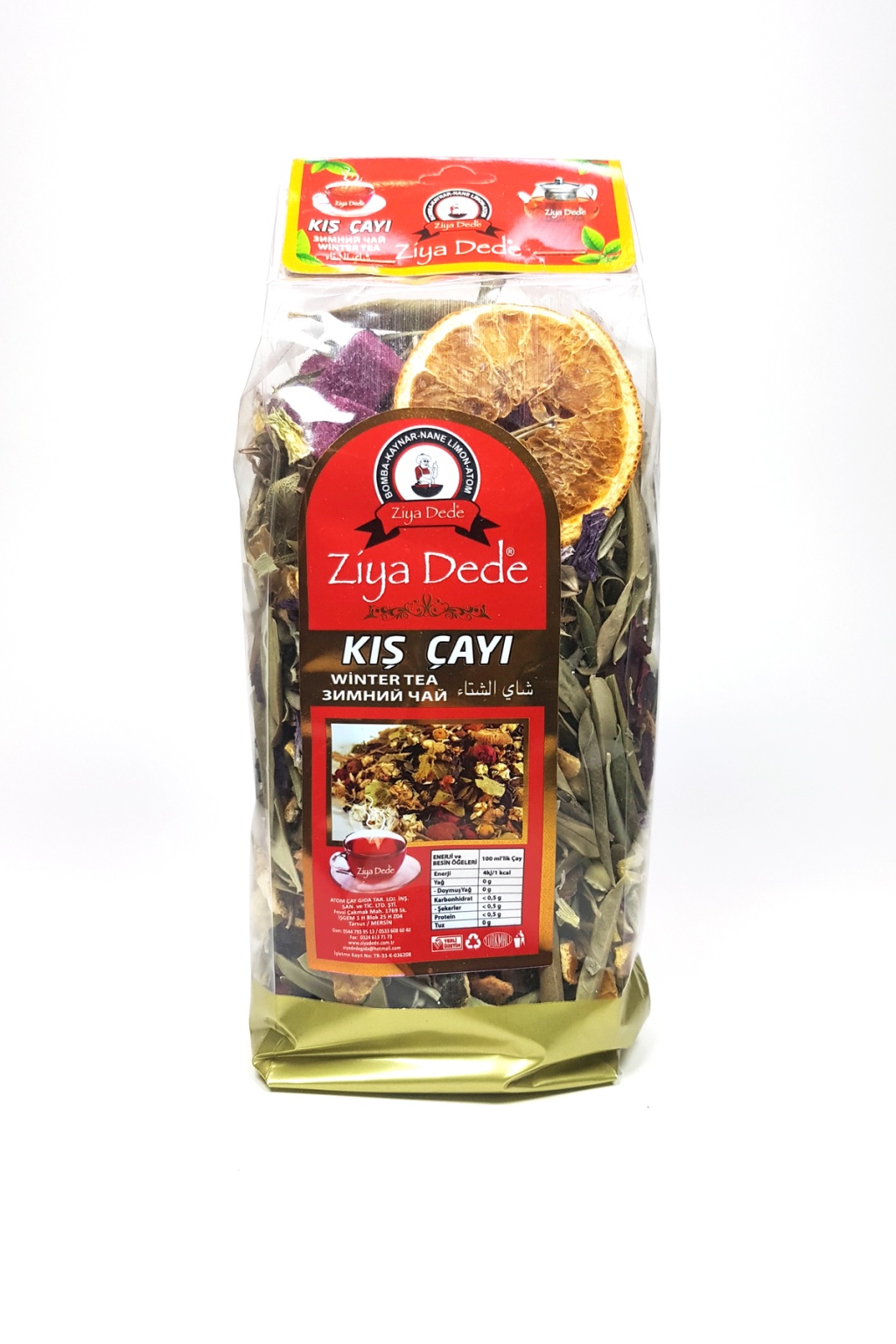 | 2 Adet Ziya Dede Bomba Özel Kış Çayı 200 Gr 12 li Karışım İçeriği : Hibiskus, Portakal Kabuğu, Nar Çiçeği, Mersin Yaprağı, Ada Çayı, Htmi Çiçeği, Zeytin Yaprağı, Nar Kabuğu, Okaliptus, Kekik, Papatya, Atom Çayı. Kullanım Şekli: Karışımı oluşturan bütün bitkilerden bir avuç kadar alınıp demlenir. 5 dakika bekletildikten sonra tüketilir. |