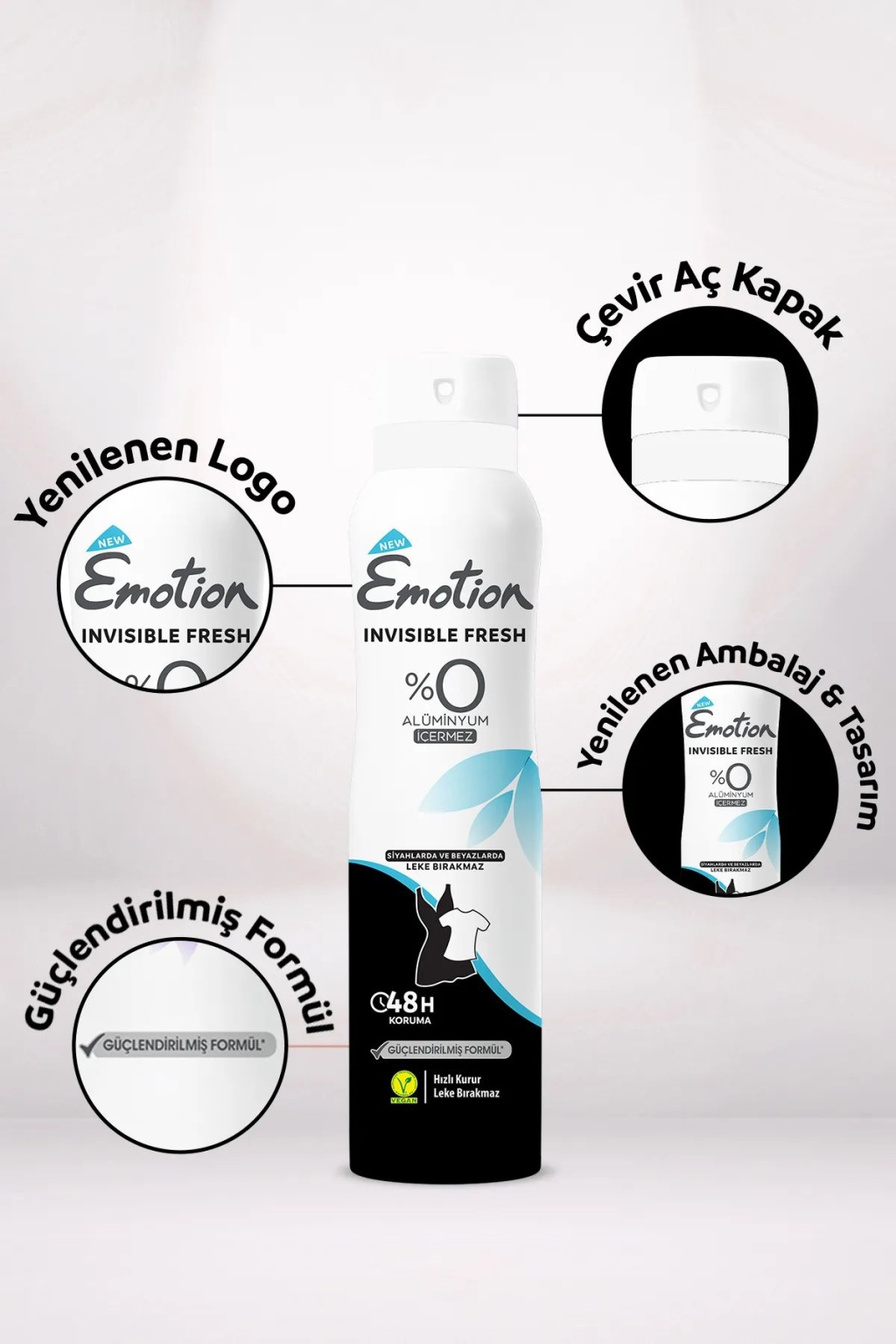 | Emotion Invisible Fresh Alüminyum içermeyen ve vücudun terleme dengesini etkilemeden 48 saat koruma sağlayan formülü ile siyahlarda iz ve beyazlarda leke bırakmaz. Fresh kokusu ile taze hissetmenizi sağlar. |
