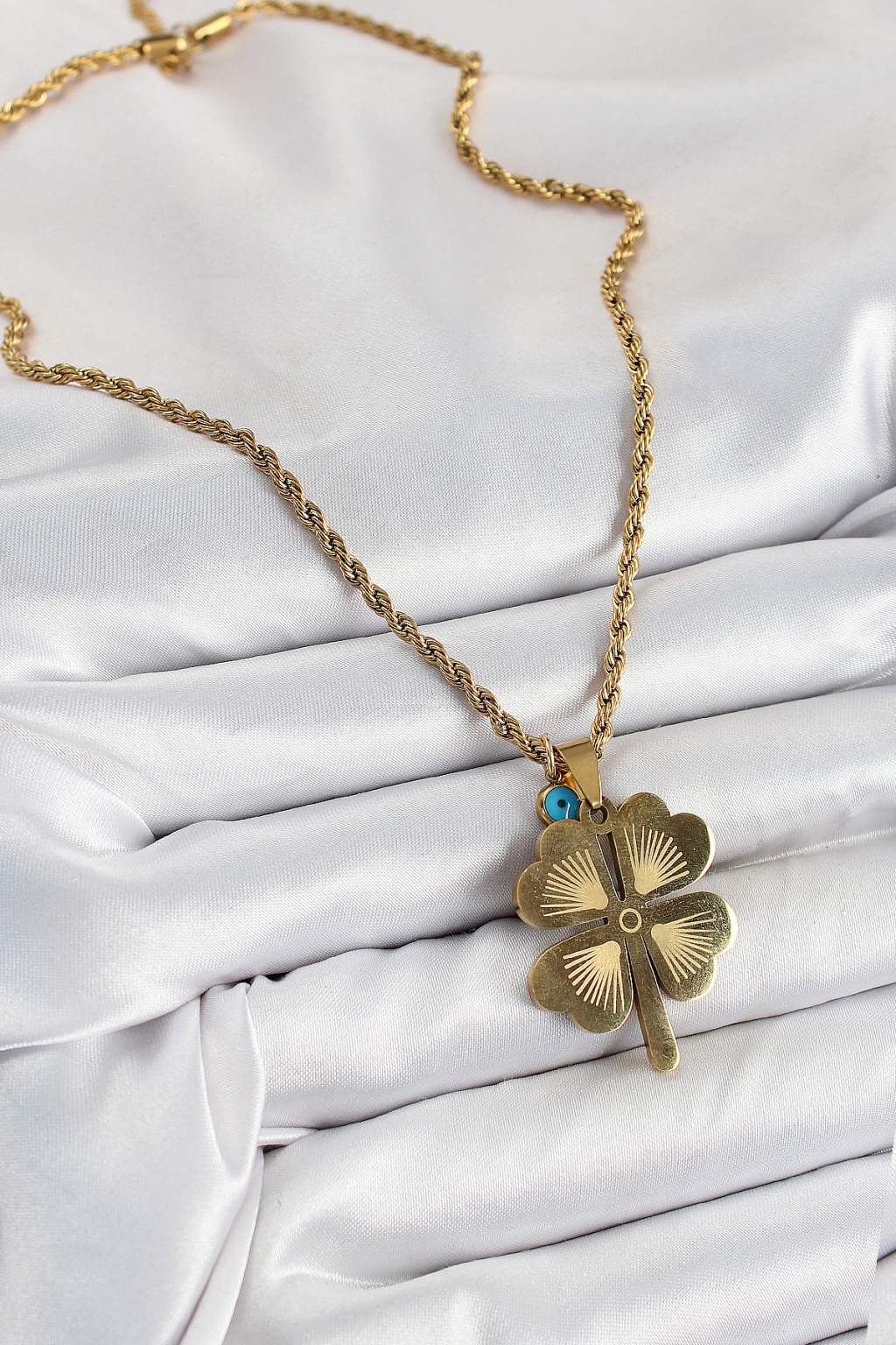 316L Çelik Burgu Zincirli Nazar Detaylı Yonca Model Gold Renk Kadın Kolye - Lisinya