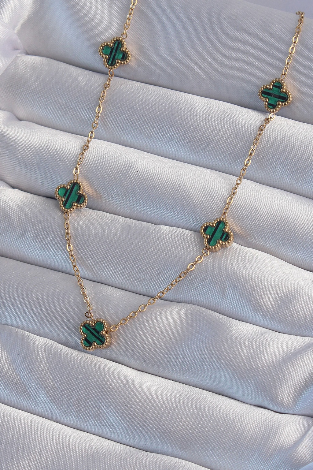 316L Çelik Gold Renk Minimal Yeşil Mineli Yonca Kolye - Lisinya