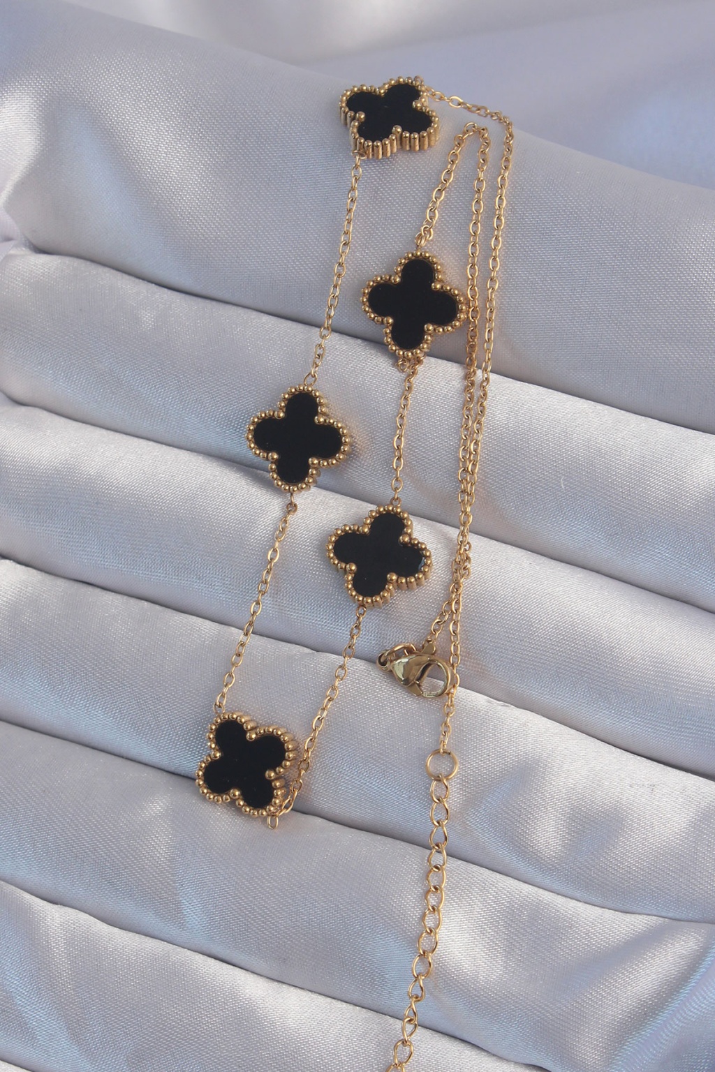 316L Çelik Gold Renk Siyah Mineli Yonca Kolye - Lisinya