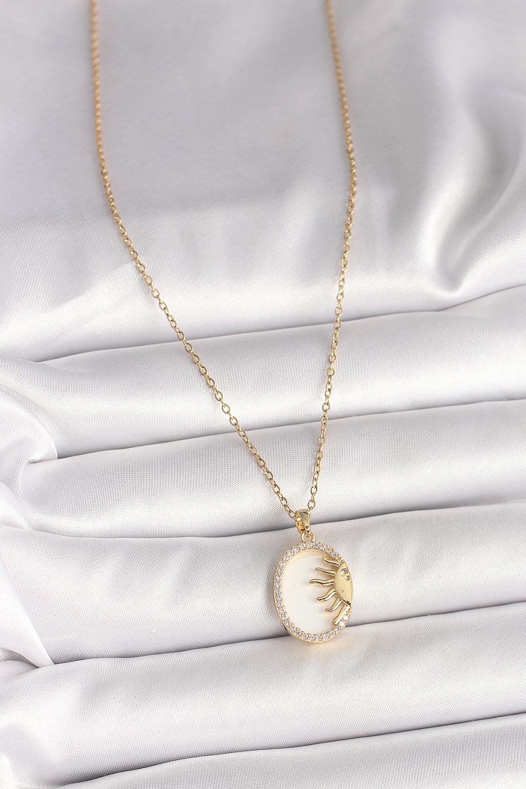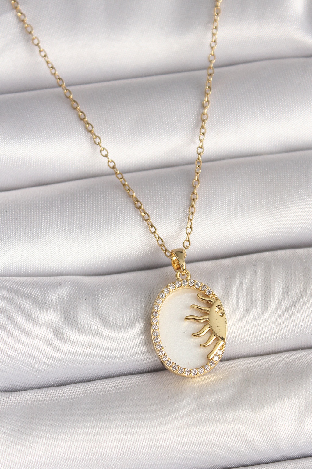 316L Çelik Gold Renk Zincir Beyaz Mineli Gün Batımı Model Zirkon Taş Detay Kadın Kolye - Lisinya
