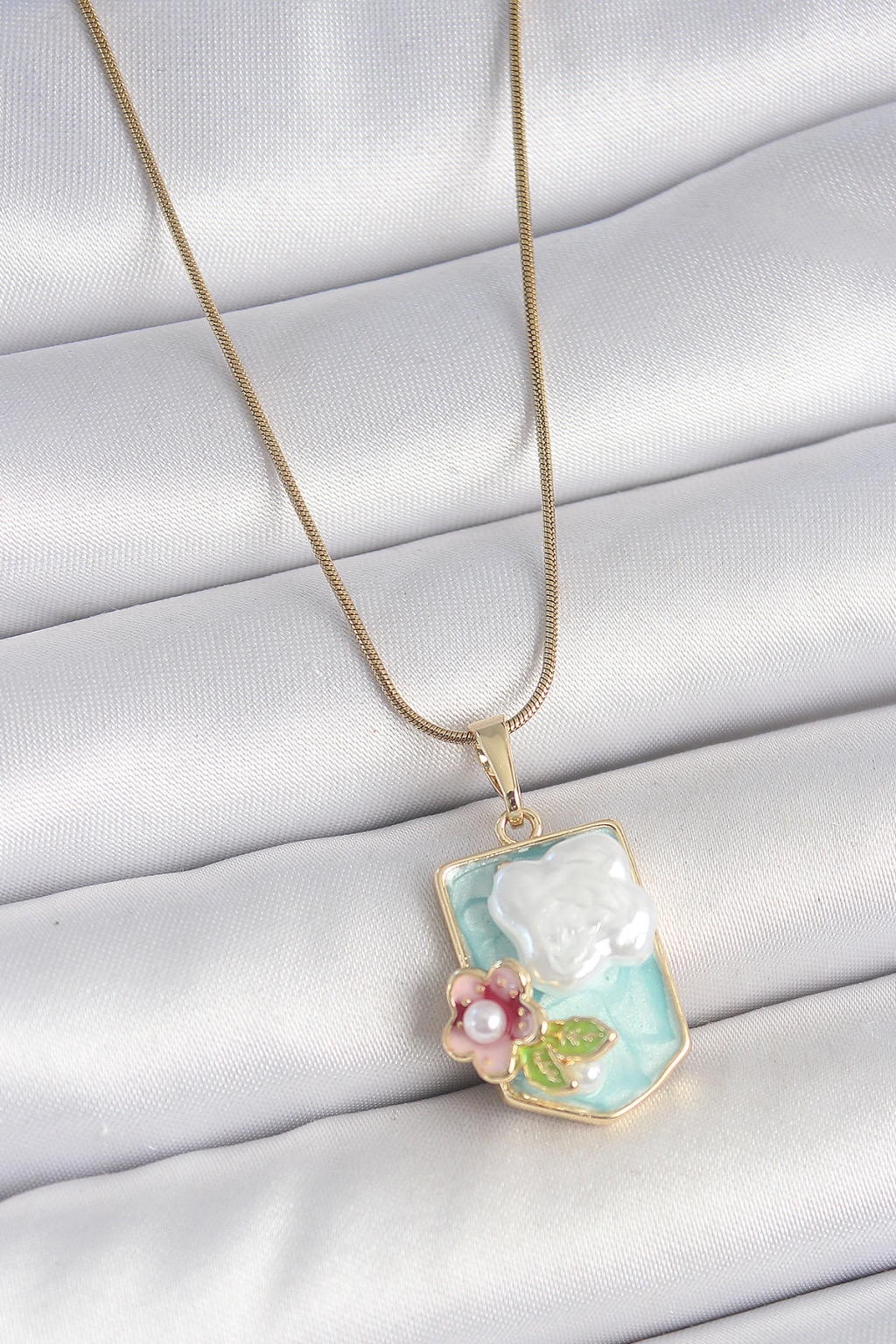 316L Çelik Gold Renk Zincir Mavi Mineli İncili Çiçek İşlemeli Portre Model Kadın Kolye -