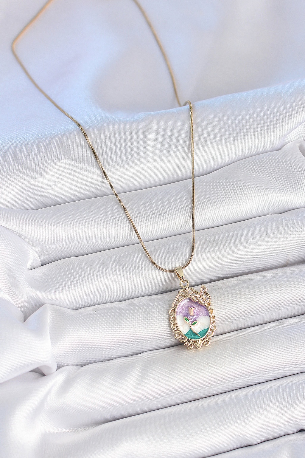 316L Çelik Gold Renk Zincir Mix Renk Mineli Çiçek İşlemeli Zirkon Taş Detaylı Portre Model Kadın Kolye - Lisinya
