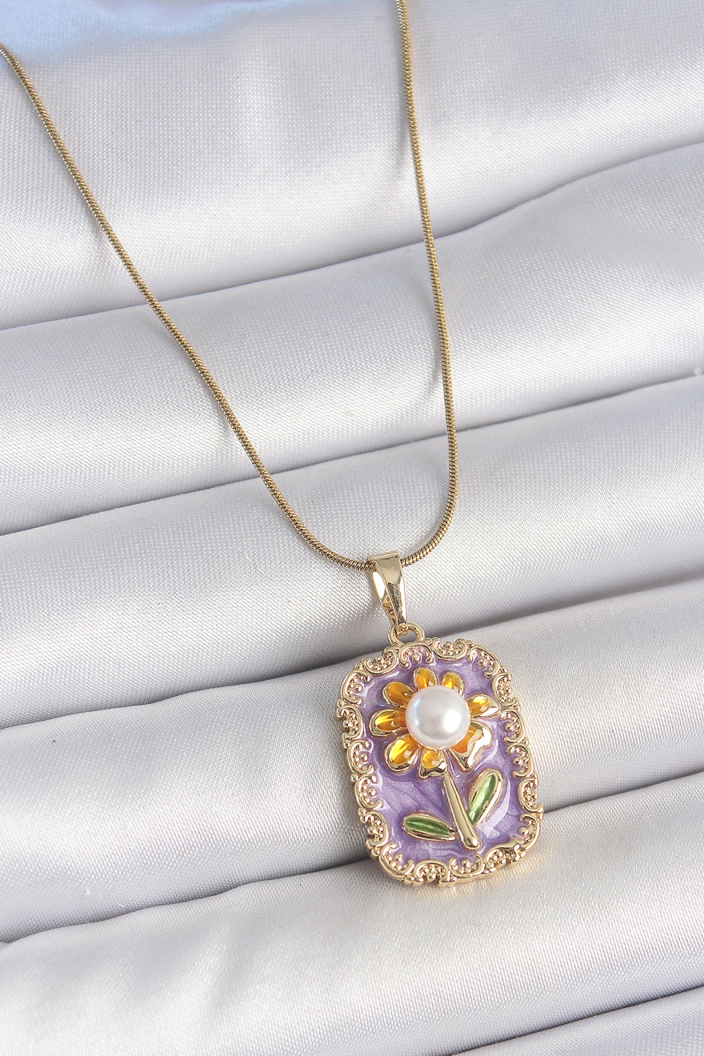 316L Çelik Gold Renk Zincir Mor Mineli İncili Papatya İşlemeli Portre Model Kadın Kolye - Lisinya