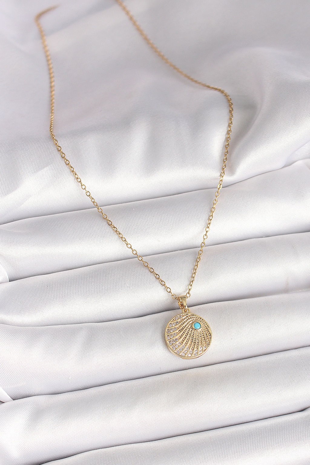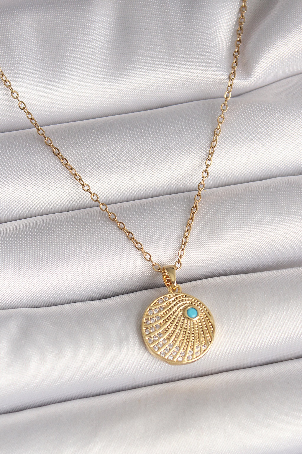 316L Çelik Gold Renk Zincir Zirkon Taş İşlemeli Mavi Taş Detaylı Madalyon Model Kadın Kolye -