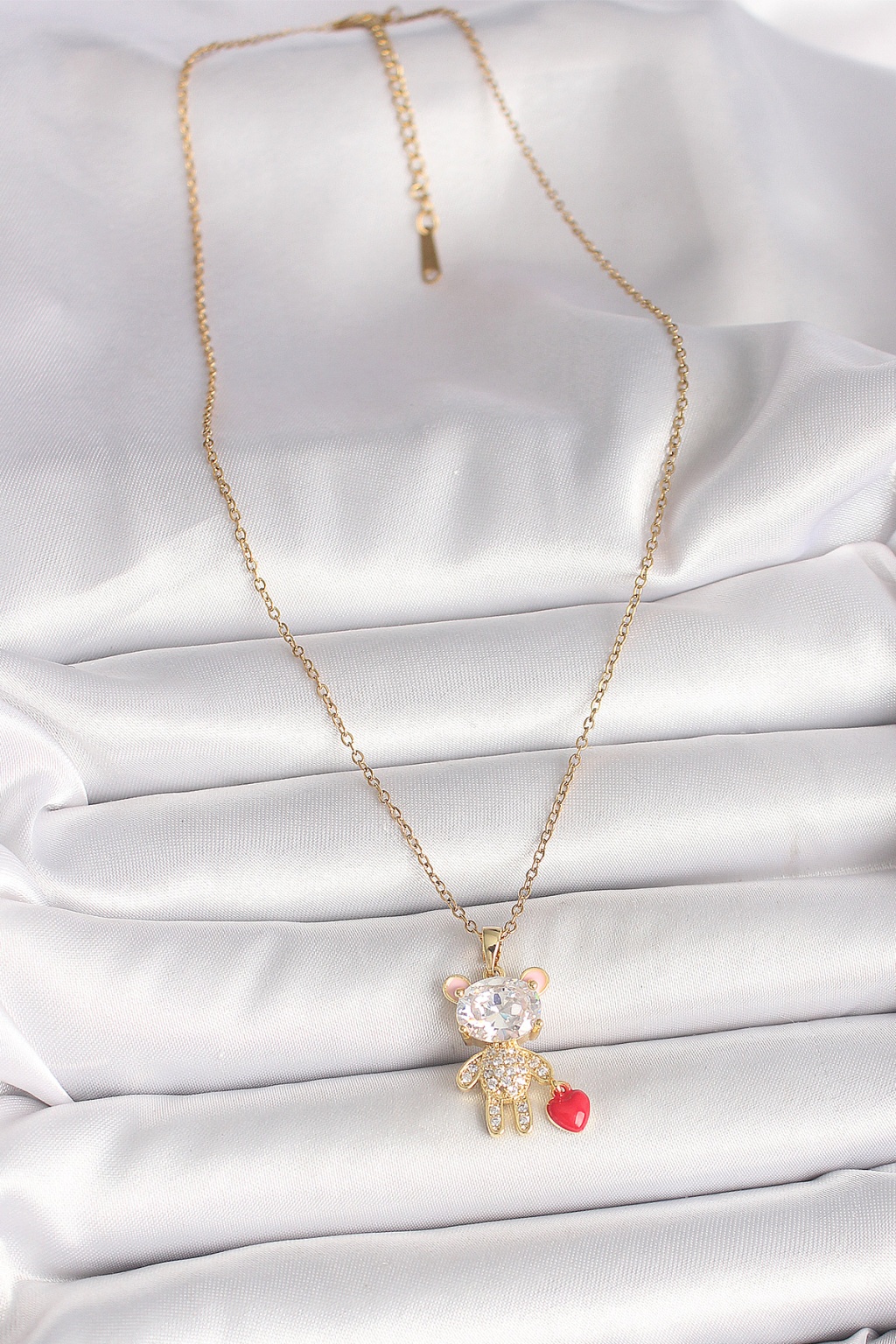 316L Çelik Gold Renk Zincir Zirkon Taşlı Ayıcık Model Kırmızı Kalp Detay Kadın Kolye - Lisinya