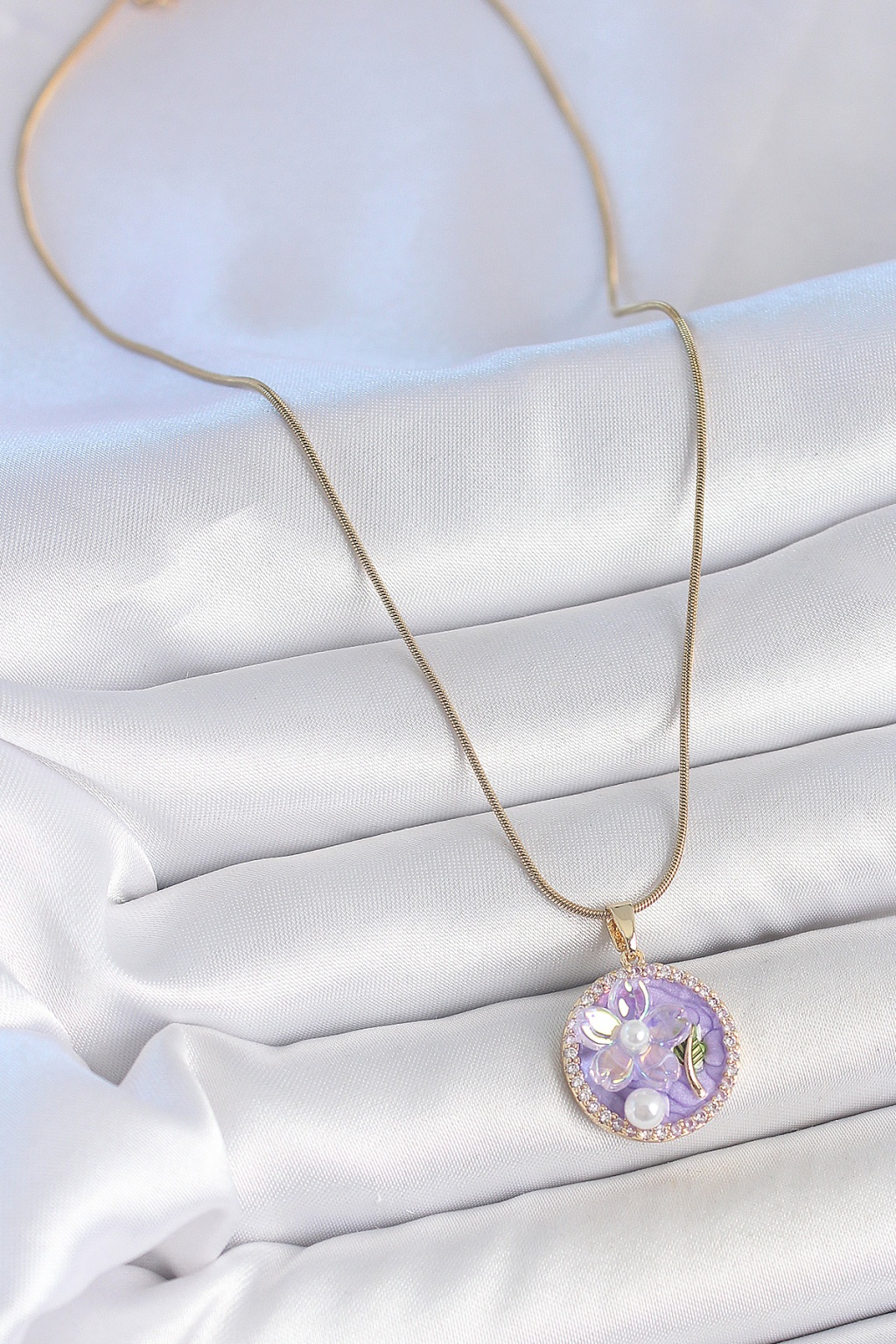 316L Çelik Gold Renk Zincir Zirkon Taşlı Mor Mineli Çiçek İşlemeli İnci Detay Portre Model Kadın Kolye - Lisinya