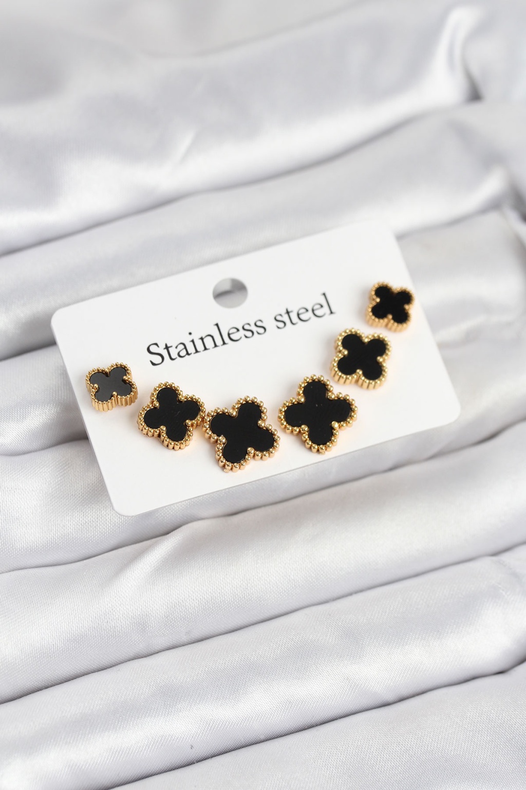 316L Çelik Gold Siyah Renk 3 Boy Yonca Küpe Seti -