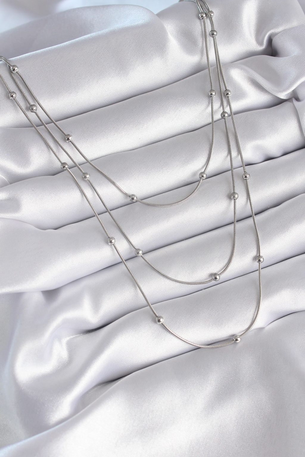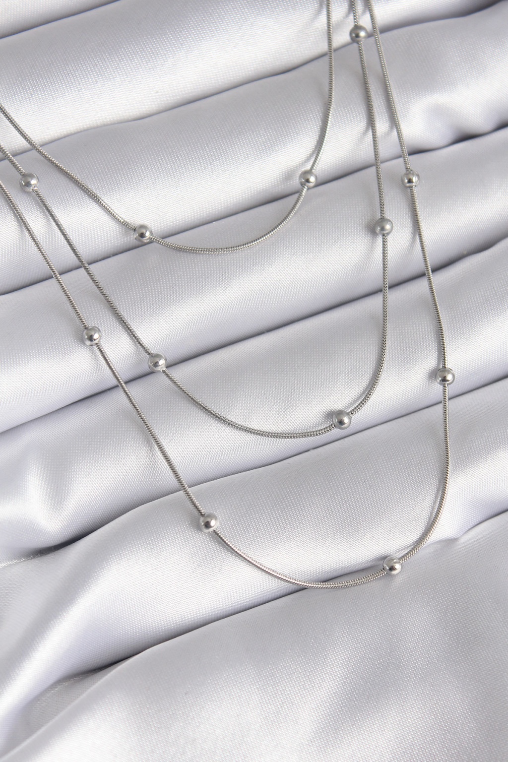 316L Çelik Gümüş Renk 3'lü Topçuk Detay Kadın Kolye -
