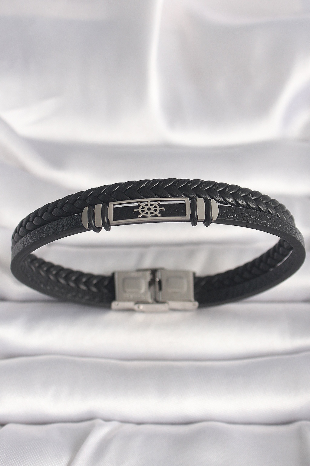 316L Çelik Gümüş Renk Gemi Dümeni Figür Siyah Burgu Deri Kordon Model Erkek Bileklik -