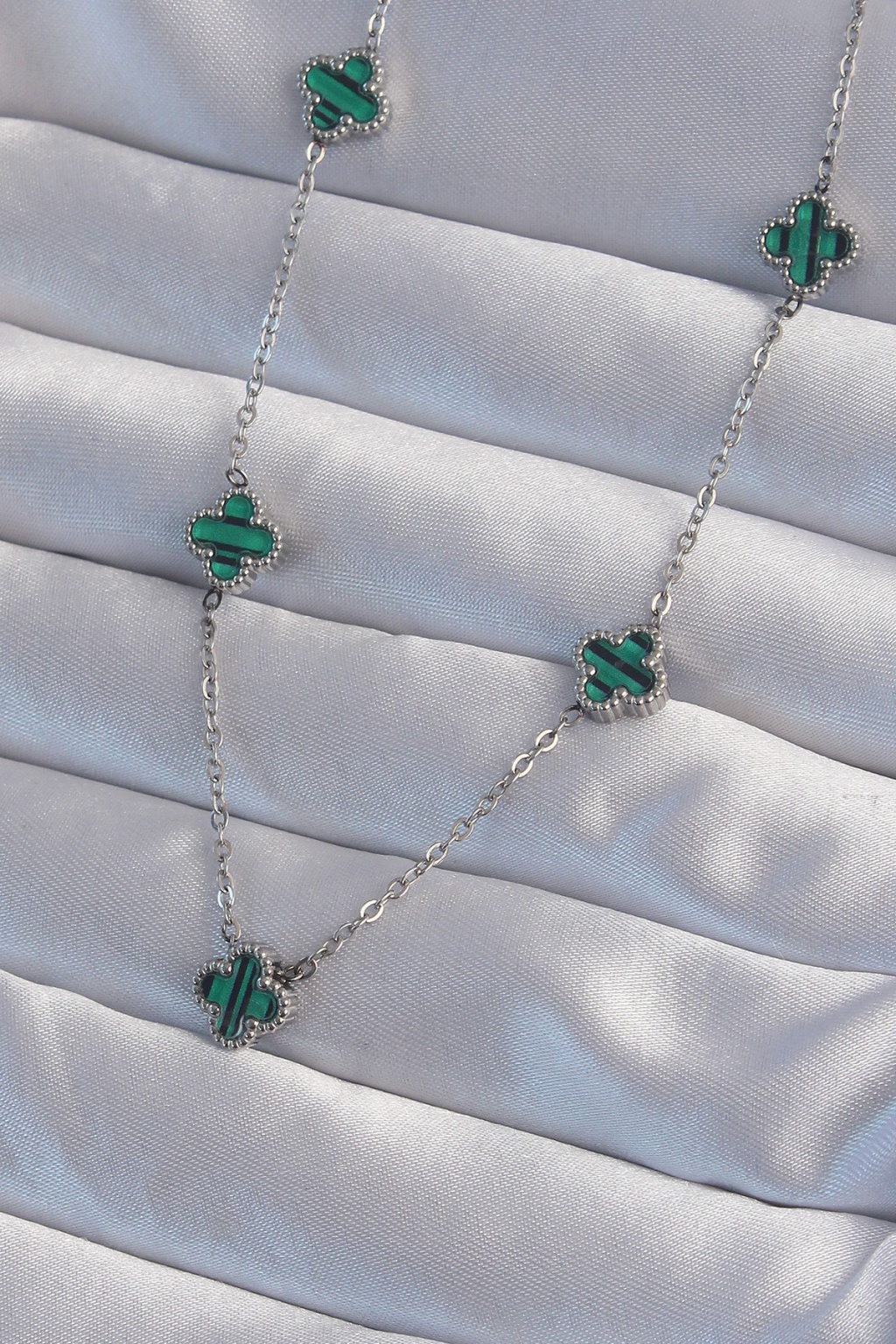 316L Çelik Gümüş Renk Minimal Yeşil Mineli Yonca Kolye - Lisinya
