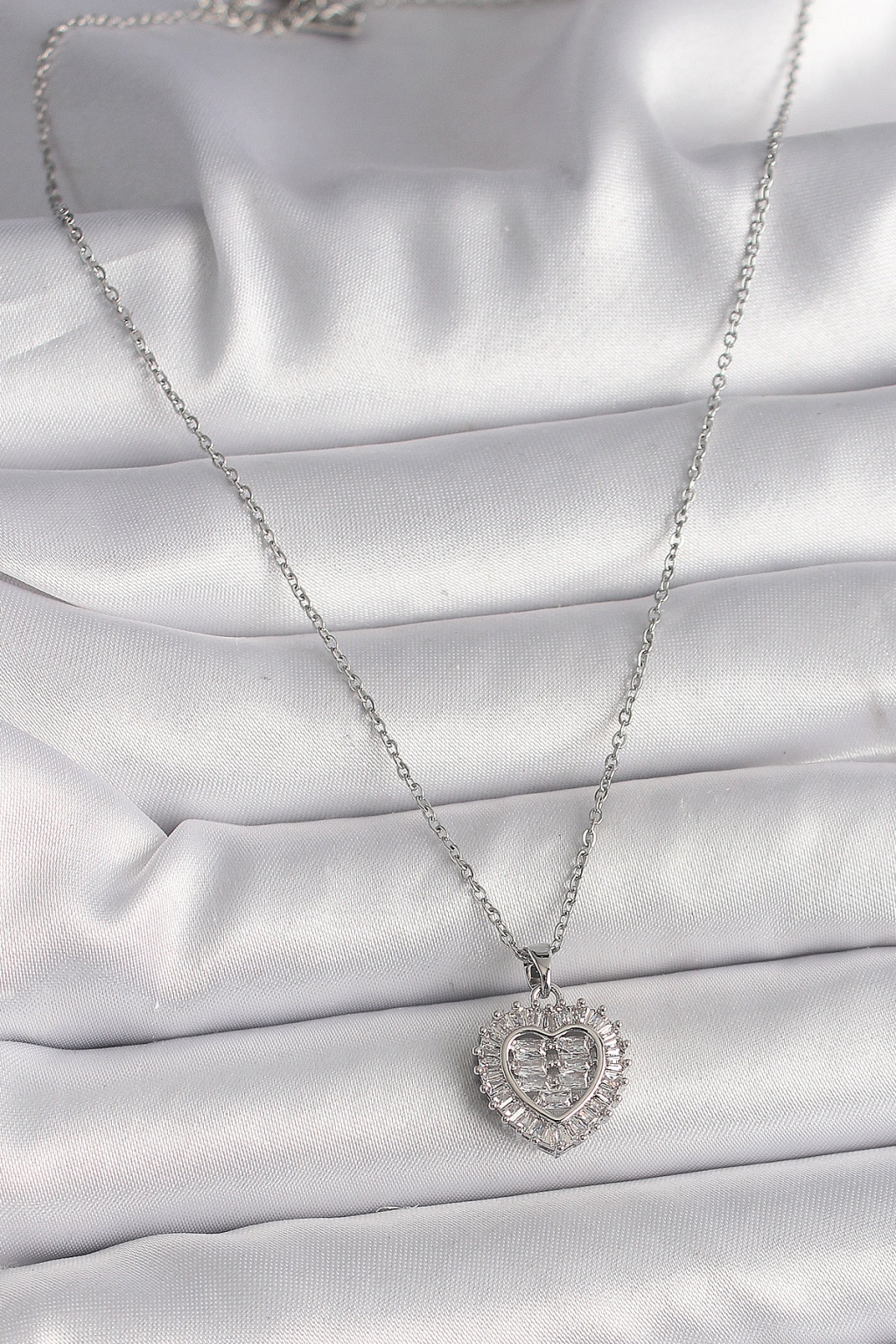 316L Çelik Gümüş Renk Zincir Zirkon Taşlı Kalp Model Kadın Kolye - Lisinya