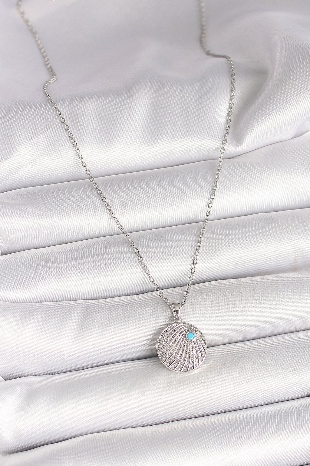 316L Çelik Gümüş Renk Zincir Zirkon Taşlı Mavi Taş Detaylı Madalyon Model Kadın Kolye -