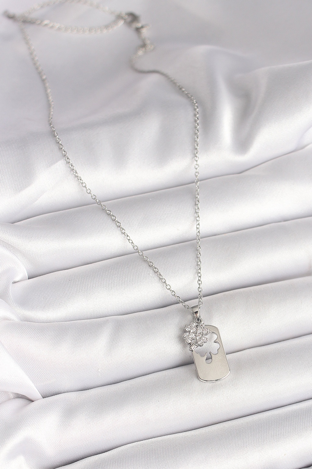 316L Çelik Gümüş Renk Zincir Zirkon Taşlı Yonca Model Kadın Kolye -