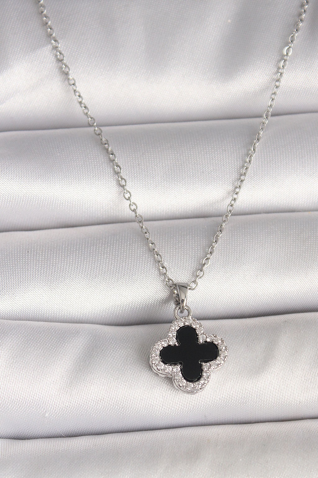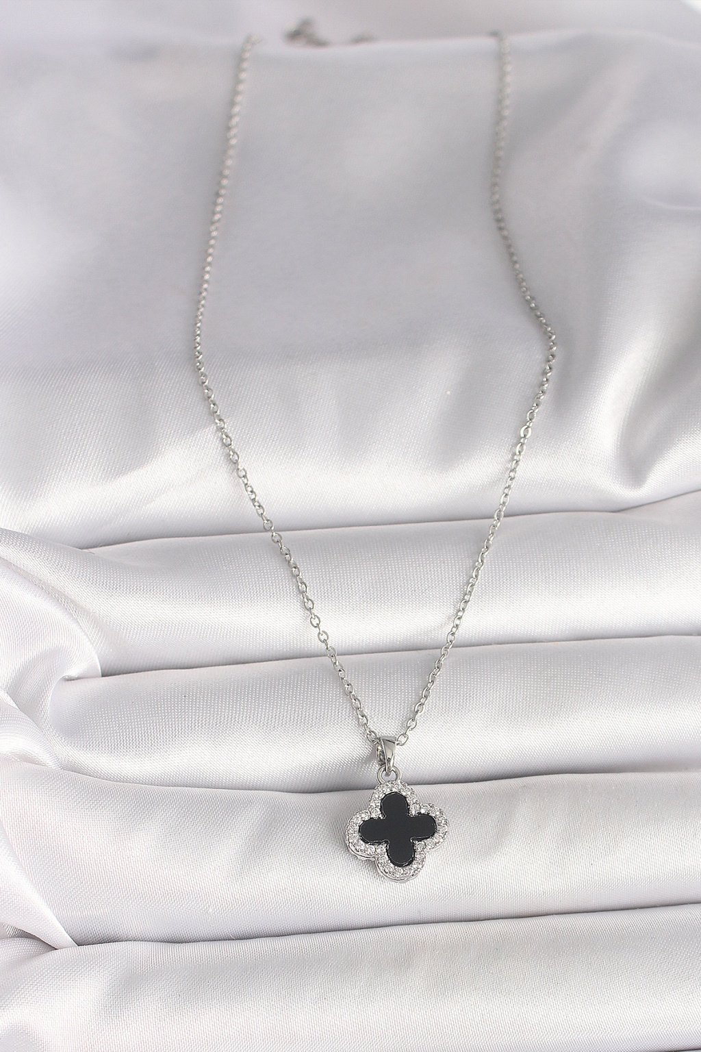 316L Çelik Gümüş Renk Zincir Zirkon Taşlı Yonca Model Kadın Kolye - Lisinya