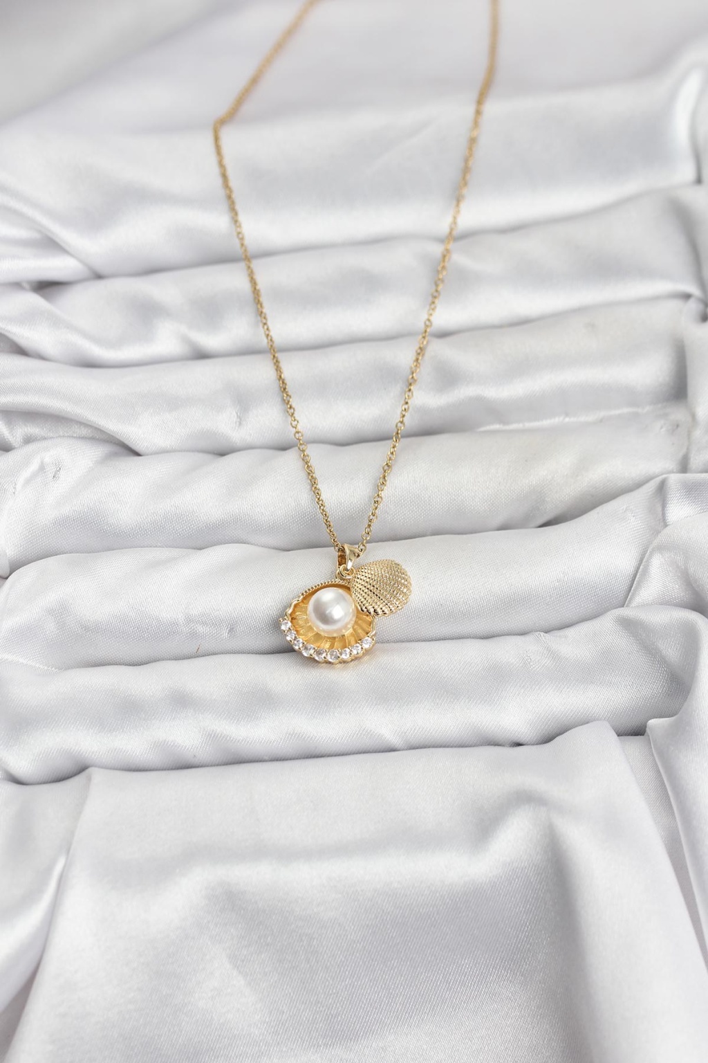 316L Çelik Zincir Gold Renk İncili Deniz Kabuğu Model Zirkon Taşlı Kadın Kolye - Lisinya