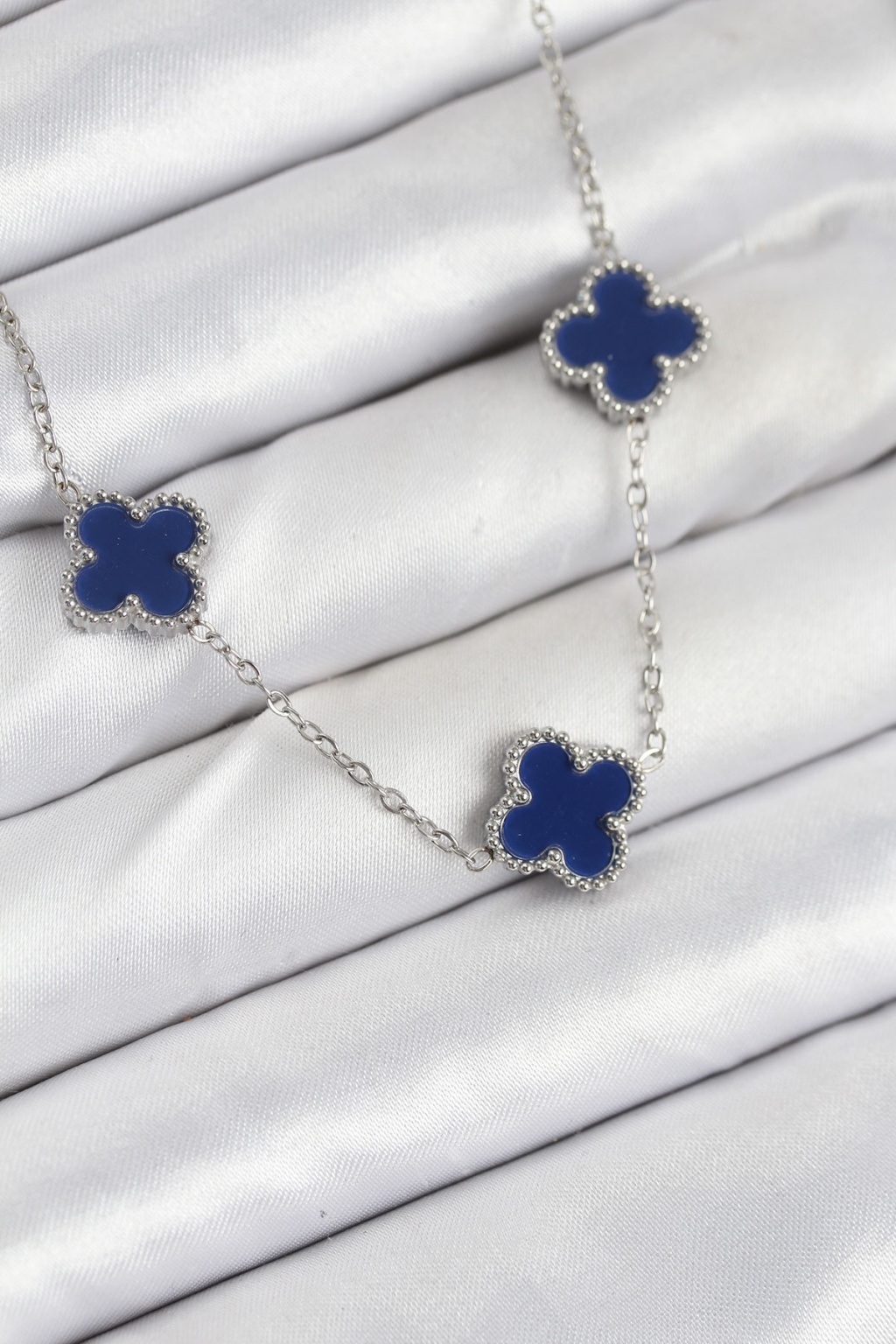 316L Çelik Zincir Gümüş Lacivert Renk Yonca Kadın Kolye -