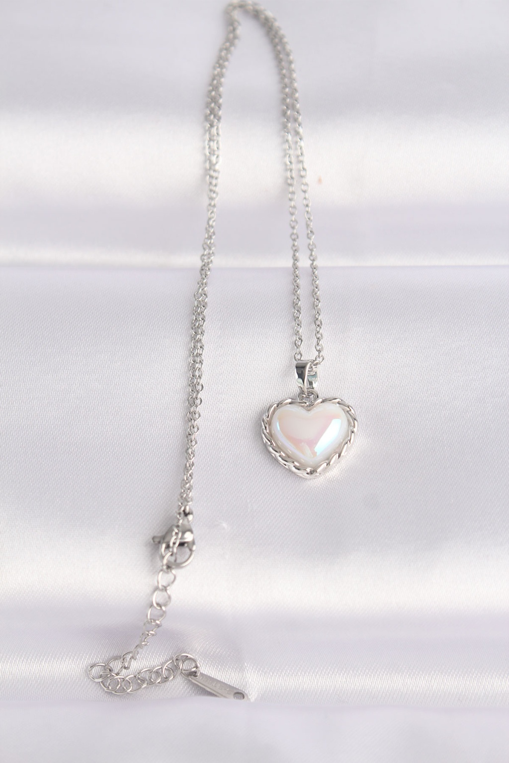 316L Çelik Zincir Gümüş Renk Beyaz Taşlı Bombeli Kalp Kolye - Lisinya