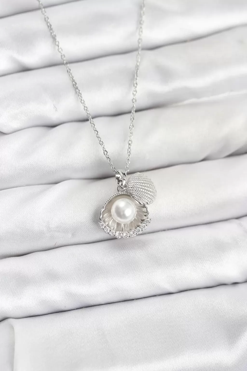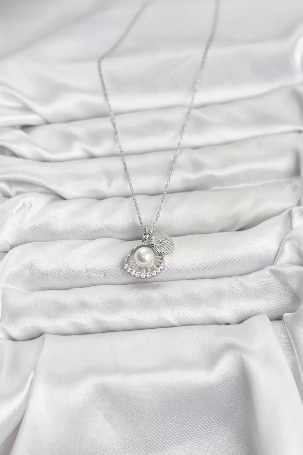 316L Çelik Zincir Gümüş Renk İncili Deniz Kabuğu Model Zirkon Taşlı Kadın Kolye