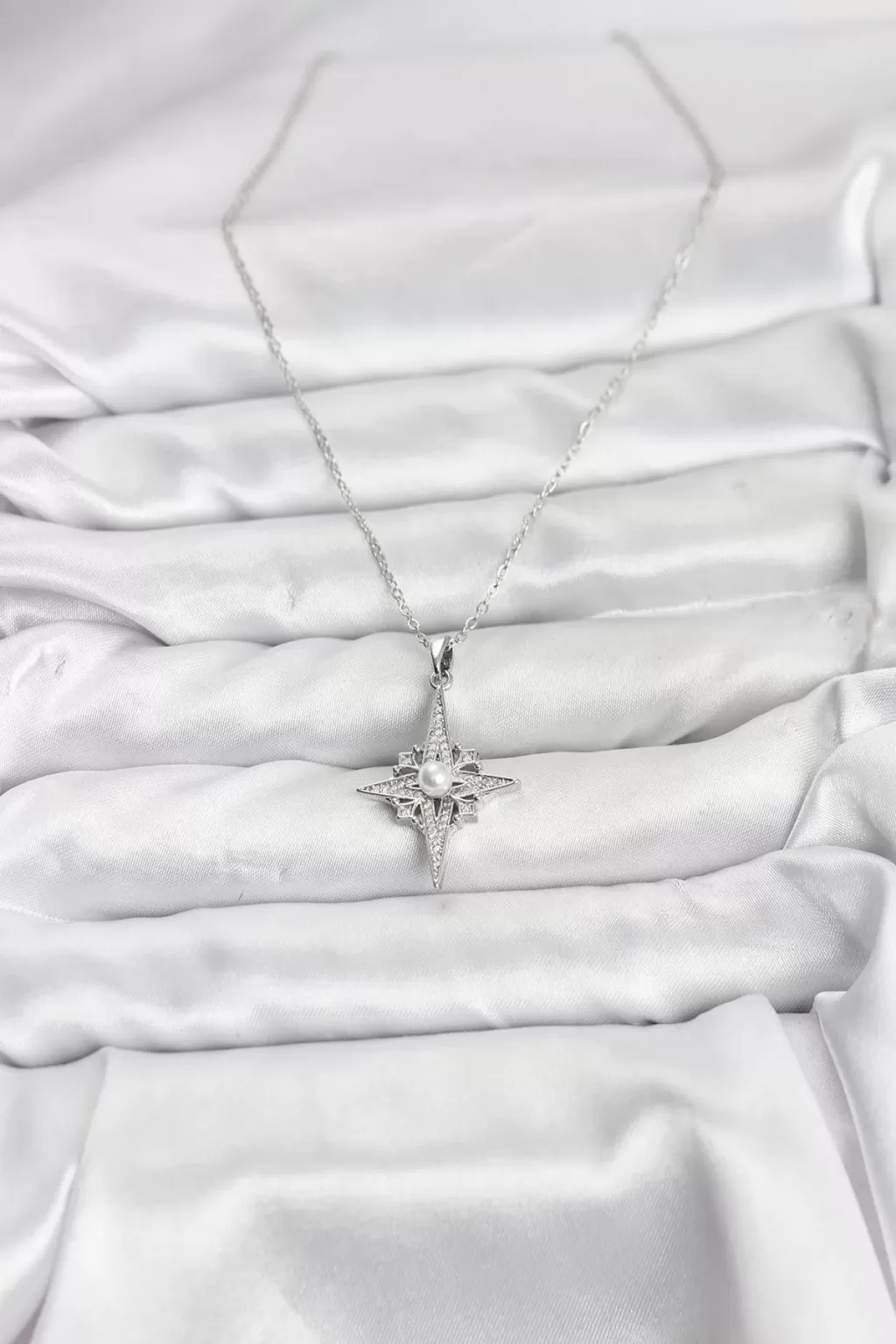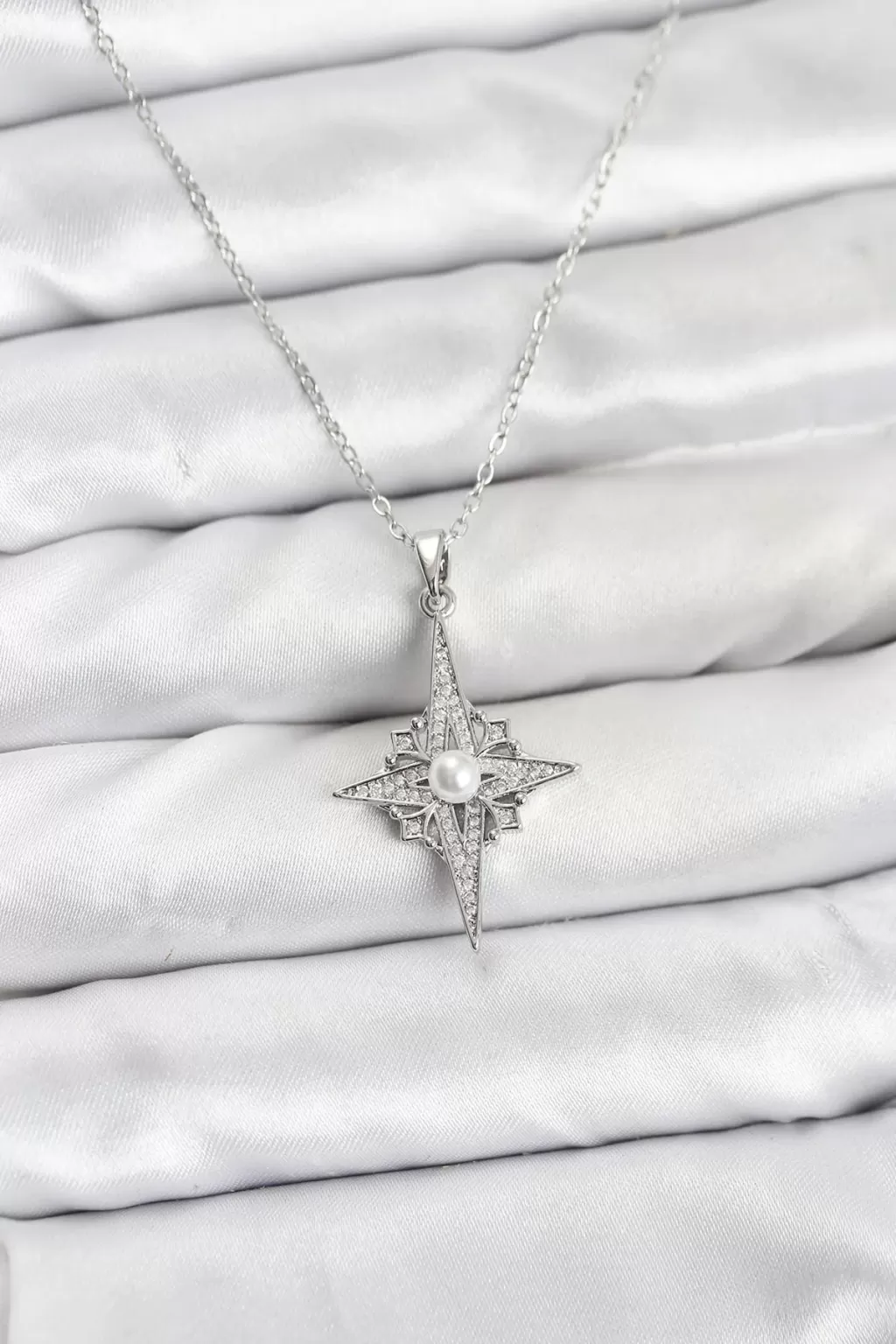 316L Çelik Zincir Gümüş Renk Kutup Yıldızı Model Zirkon Taşlı Kadın Kolye