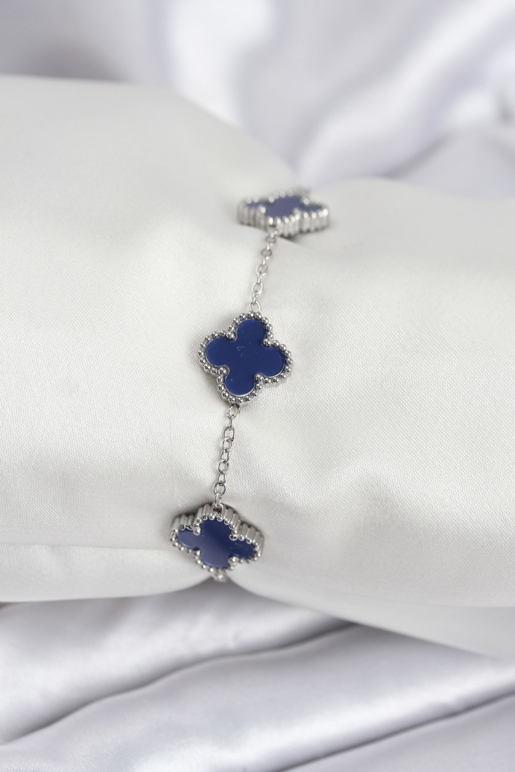 316L Çelik Zincir Gümüş Renk Lacivert Yonca Kadın Bileklik - Lisinya