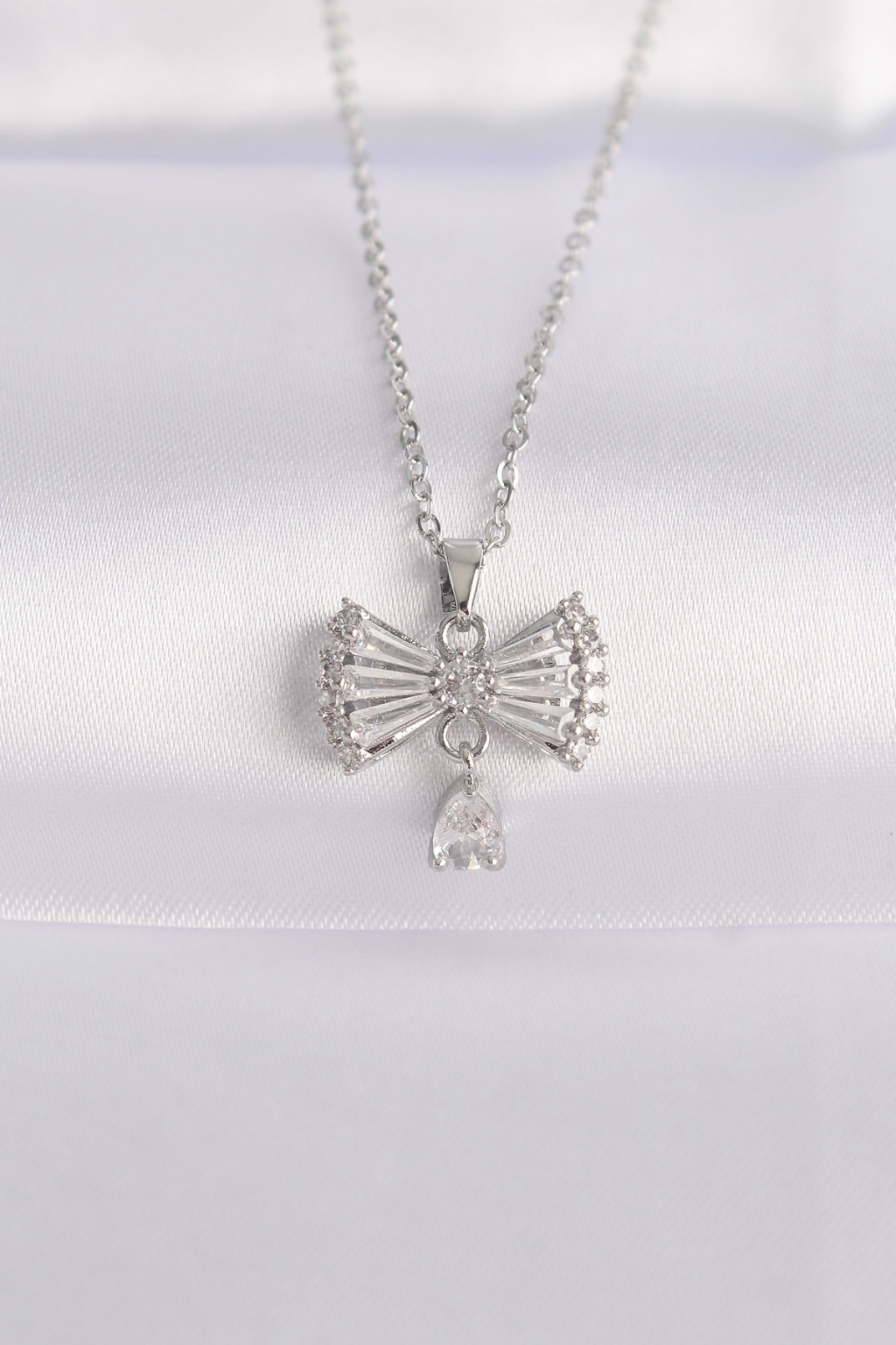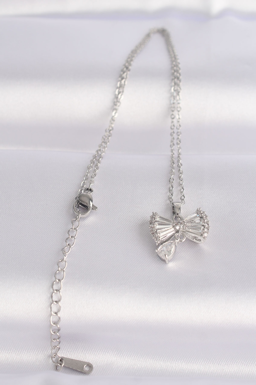 316L Çelik Zincir Gümüş Renk Zirkon Taşlı Kalp Detay Fiyonk Kolye - Lisinya