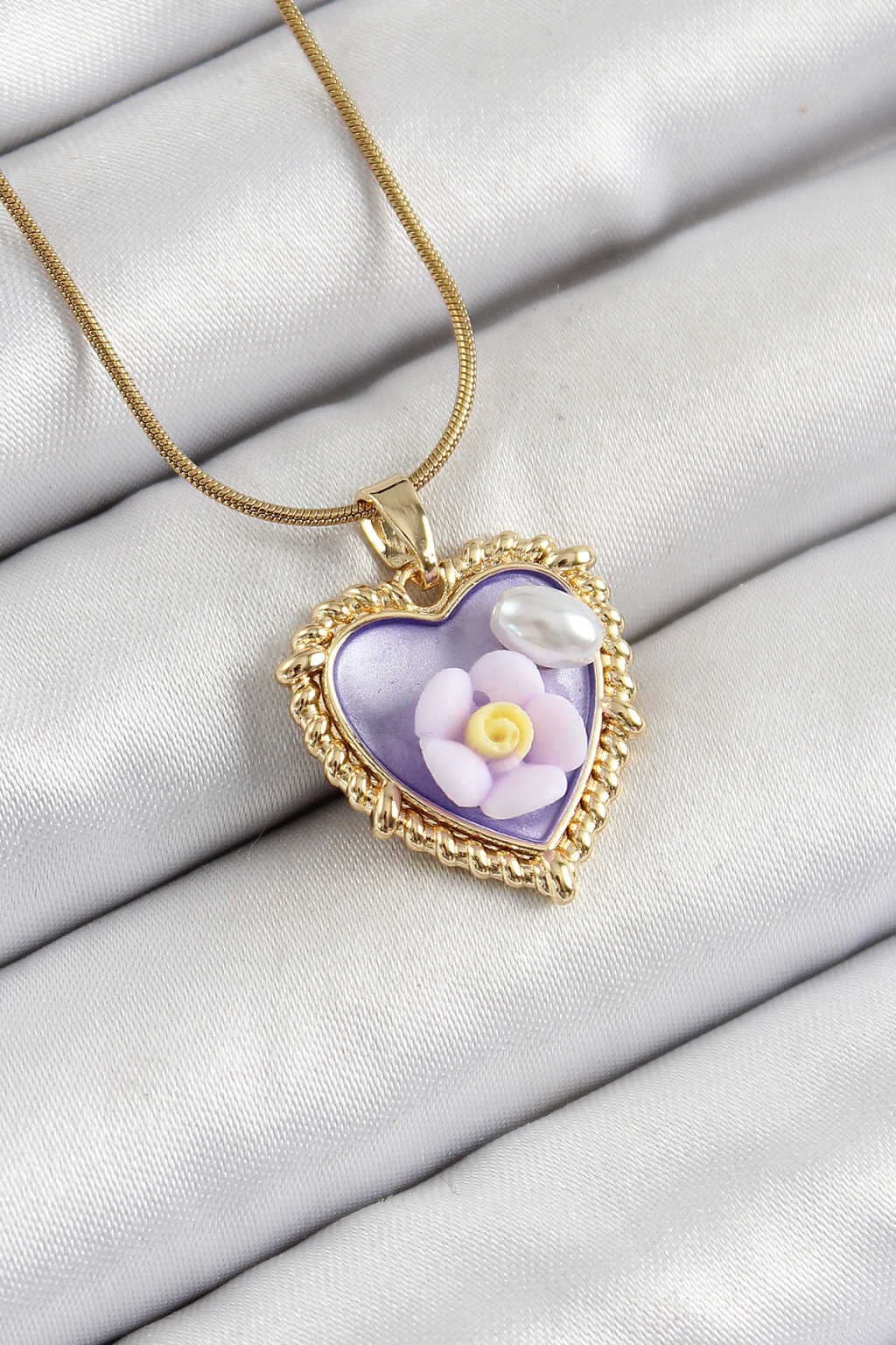 316L Çelik Zincir Mor Sanatsal Portre İnci Detaylı Papatya Figürlü Kalp Model Gold Renk Kadın Kolye -