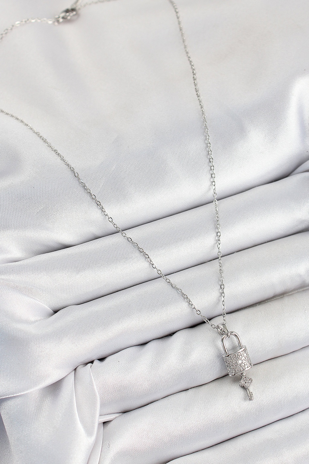 316L Çelik Zirkon Taşlı Kilit Ve Sallantılı Anahtar Model Gümüş Renk Kadın Kolye - Lisinya