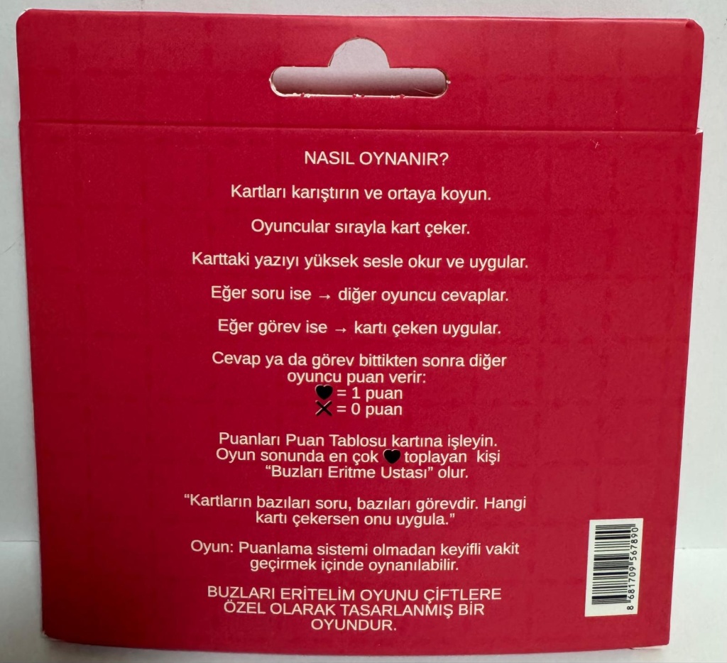 NASIL OYNANIR?Kartları karıştırın ve ortaya koyun.Oyuncular sırayla kart çeker.Karttaki yazıyı yüksek sesle okur ve uygular.Eğer soru ise → diğer oyuncu cevaplar.Eğer görev ise → kartı çeken uygular.Cevap ya da görev bittikten sonra diğer oyuncu puan verir:= 1 puanX= 0 puanPuanları Puan Tablosu kartına işleyin.Oyun sonunda en çoktoplayan kişi"Buzları Eritme Ustası" olur."Kartların bazıları soru, bazıları görevdir. Hangi kartı çekersen onu uygula."Oyun: Puanlama sistemi olmadan keyifli vakit geçirmek içinde oynanılabilir.BUZLARI ERİTELİM OYUNU ÇİFTLERE ÖZEL OLARAK TASARLANMIŞ BIR OYUNDUR.