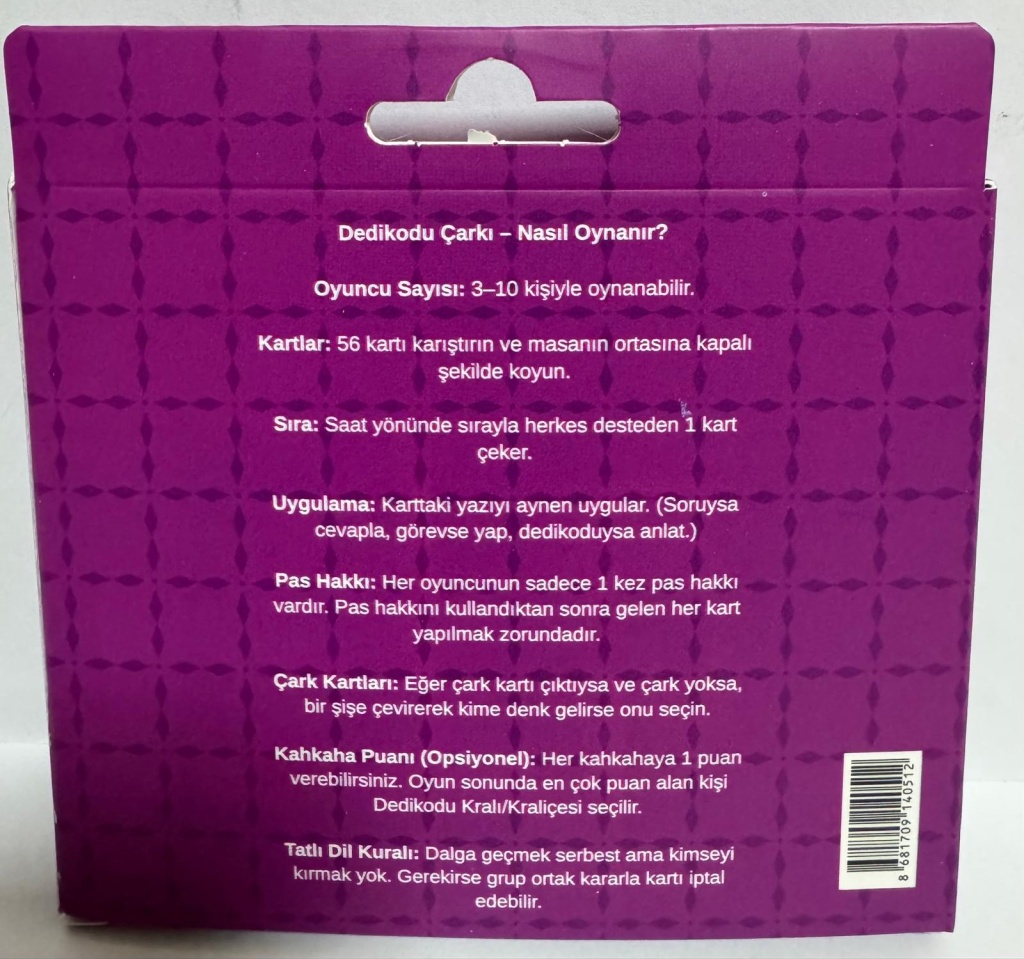 Dedikodu Çarkı - Nasıl Oynanır?Oyuncu Sayısı: 3-10 kişiyle oynanabilir.Kartlar: 56 kartı karıştının ve masanın ortasına kapalışekilde koyun.Sıra: Saat yönünde sırayla herkes desteden 1 kart çeker.Uygulama: Karttaki yazıyı aynen uygular. (Soruysa cevapla, görevse yap, dedikoduysa aniat.)Pas Hakkı: Her oyuncunun sadece 1 kez pas hakkı verdir. Pas hakkını kullandıktan sonra gelen her kart yapılmak zorundadir.Çark Kartlan Eğer çark kartı çıktıysa ve çark yoksa bir sişe çevirerek kime denk gelirse onu seçin.Kahkaha Puanı (Opsiyonel): Her kahkahaya 1 puan verebilirsiniz. Oyun sonunda en çok puan alan kişDedikodu Kralı/Kraliçesi seçilir.Tath Dil Kurak: Daiga geçmekserbest ama kimseyı kirmak yok. Gerekirse grup ortak kararle kart iptal edebilir.