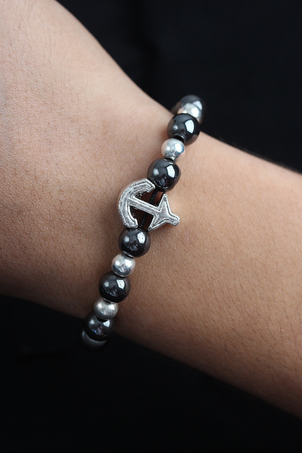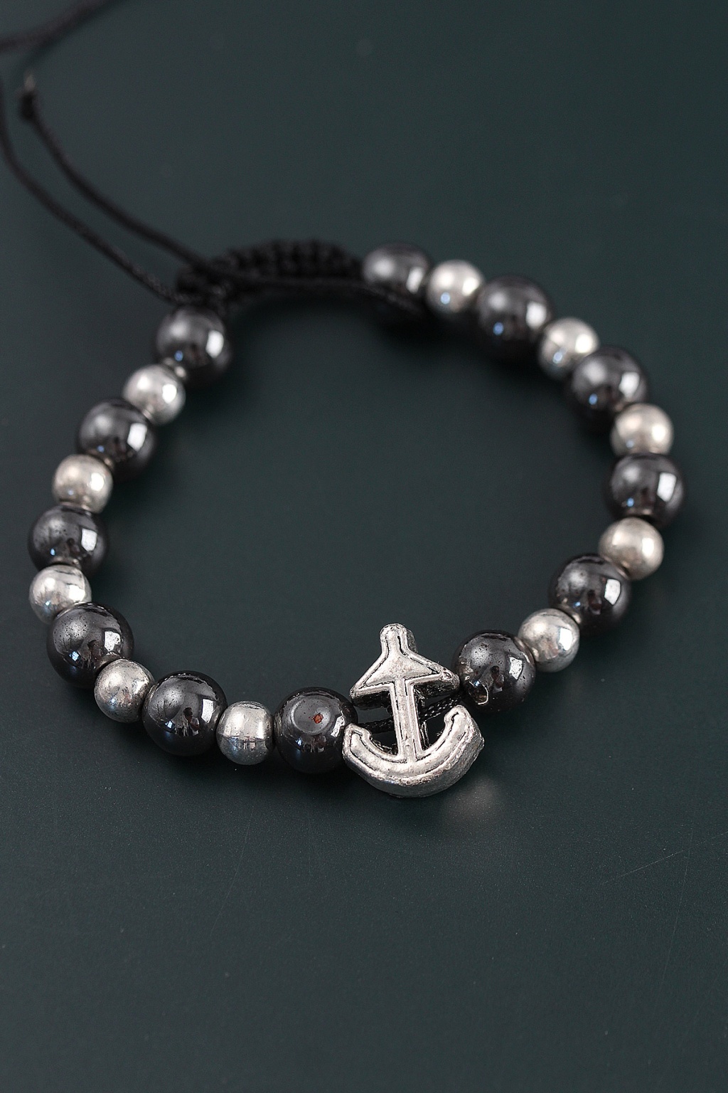 Doğal Taş Çapa Model Gümüş Ve Füme Renk Asansörlü Erkek Bileklik - Lisinya