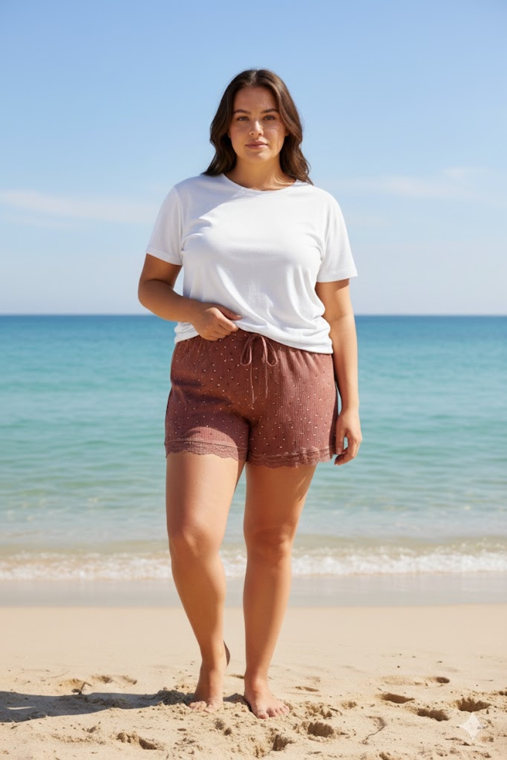 Düz Renk Mini Çiçek Desenli Penye Kadın Ev Şortu Bacak Dantel Detaylı Ev Giyim Taba