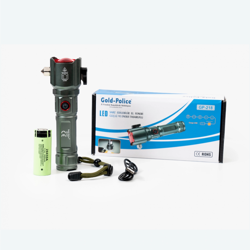 Gold Police GP-218 acil durum el feneri, güvenliğinizi ön planda tutarken güçlü ve uzun menzilli aydınlatma sağlayan kaliteli bir el feneridir. GP-218 el feneri, güvenlik ve aydınlatmanın mükemmel birleşimi olarak, iş güvenliği ortamlarında kullanım için ideal bir seçimdir. GP-218 el feneri, güçlü aydınlatma kapasitesi ve hayati güvenlik özellikleriyle, zorlu çalışma koşullarında güvenilir bir performans sunar.Gold Police GP-218 Acil Durum El Feneri ÖzellikleriGüçlü Aydınlatma:nbsp3000 lümen parlak beyaz LED ışık sağlayarak 1000 metreye kadar mükemmel görüş mesafesi sağlar.Dayanıklı Yapı:nbspAlüminyum alaşımdan üretilmiş, tamamen paslanmaz çelik ve su geçirmez gövdeye sahip olması, çeşitli koşullarda güvenilir olmasını sağlar.Acil Durum Aletleri:nbspAcil durumlarda kırma veya kesme işlemleri için ideal, emniyet çekici ve kesme bıçağı ile donatılmıştır.Çalışma Modları:nbsp3 aydınlatma modu (yüksek ışık, düşük ışık, flaşör) ve 2 acil durum aydınlatma modu (kırmızı ve mavi yanıp sönen ışıklar, beyaz COB LED) sunar.Teleskopik Yakınlaştırma:nbspAyarlanabilir odaklama için teleskopik yakınlaştırma özelliğine sahiptir ve ışığı en çok ihtiyaç duyulan yere yoğunlaştırmanızı sağlar.Powerbank Fonksiyonu:nbspKritik anlarda diğer cihazlarınızı şarj edebilmeniz için dahili powerbank özelliğine sahiptir.Uzun Ömürlü Pil:nbsp5000 mAh kapasiteli 26650 pil ile güçlendirilmiştir ve uzun süreli kullanım sağlar.Kolay Şarj:nbspHızlı ve kolay şarj için Type-C şarj portu ile birlikte gelir.nbspTeknik ÖzellikleriGÖVDE RENGİGriIŞIK ÖZELLİĞİ30 WATT TG LEDIŞIK RENGİParlak BeyazAYDINLATMA1000 MetreBATARYA26650 şarj edilebilen pil 5000 mAhMODZOOM, yüksek ışık, düşük ışık, flaşörKULLANIM ÖZELLİKLERİSu Geçirmez El Feneri,nbsp Uzun Menzilli Aydınlatma, Kamp Feneri, Güvenlik Feneri. Ürün Markası: Lisinya
