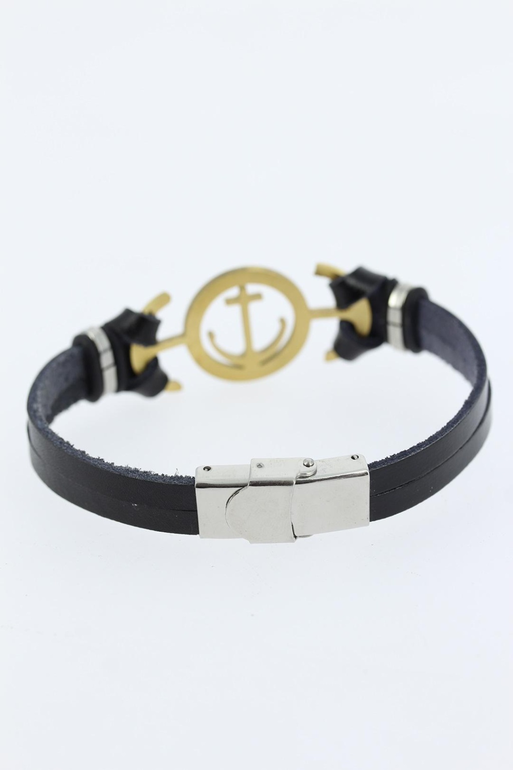 Gold Renk Deniz Çapası Figürlü Metal Aksesuarlı Siyah Renk Deri Erkek Bileklik -