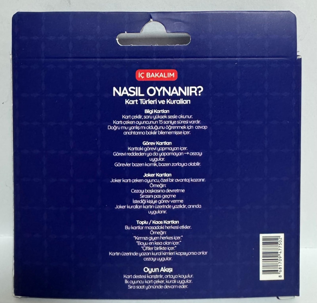 IÇ BAKALIMNASIL OYNANIR?Kart Türleri ve KurallanBlgi KartlanKart çeklir, soru yüksek sesle okunur.Kart çeken oyuncunun 15 saniye süresi vardır.Dogrumuyants moldugunu Ogrenmek için vevap anahtarına bakılır  bilememişse içer.Görev KartlanKarttaki görevi yapmayan içer.Görevi reddeden ya da yapamayan→ cezayı uygular.Görevler bazen komik bazen zorlayıa olabilır:Joker KartlanJoker kartı çeken oyuncu özel bir avantaj kazanır.ÖmeğinCezay başkasına devretmeSrasn pas geameIstediği kişlye görev vermeJoker kurallan kartın üzerinde yazılıdır, arında uygulanır.Toplu/Kaos KartlanBu kartlar masadaki herkesi etkiler.Ömeğin:Kirma gyen herkes Içer.*"Boyu en kısa olan içer.""Ciftler birikte ker."Kartın üzerinde yazan kural kimleri kapsyorsa onlar cezayl uygular.Oyun AkışıKart destesi kanıştınır, ortaya koyulur.Ilk oyuncu kart çeker, kural uygular:Sra saat yonunde devam eder.