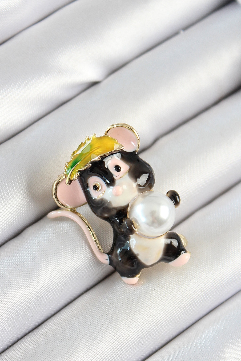 İnci Detaylı Siyah Ve Pembe 3D Sevimli Fare Figürlü Gold Renk Kadın Broş -