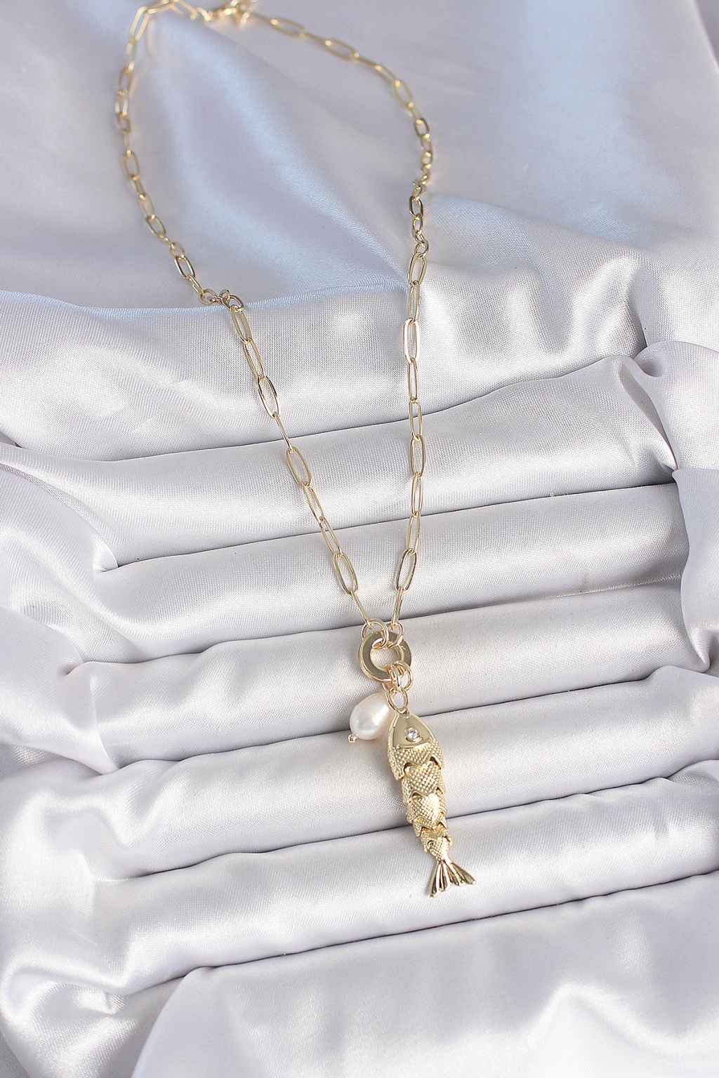 İnci Detaylı Zirkon Taşlı Balık Figürlü Gold Renk Pirinç Kolye - Lisinya
