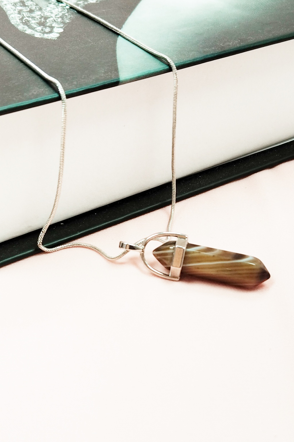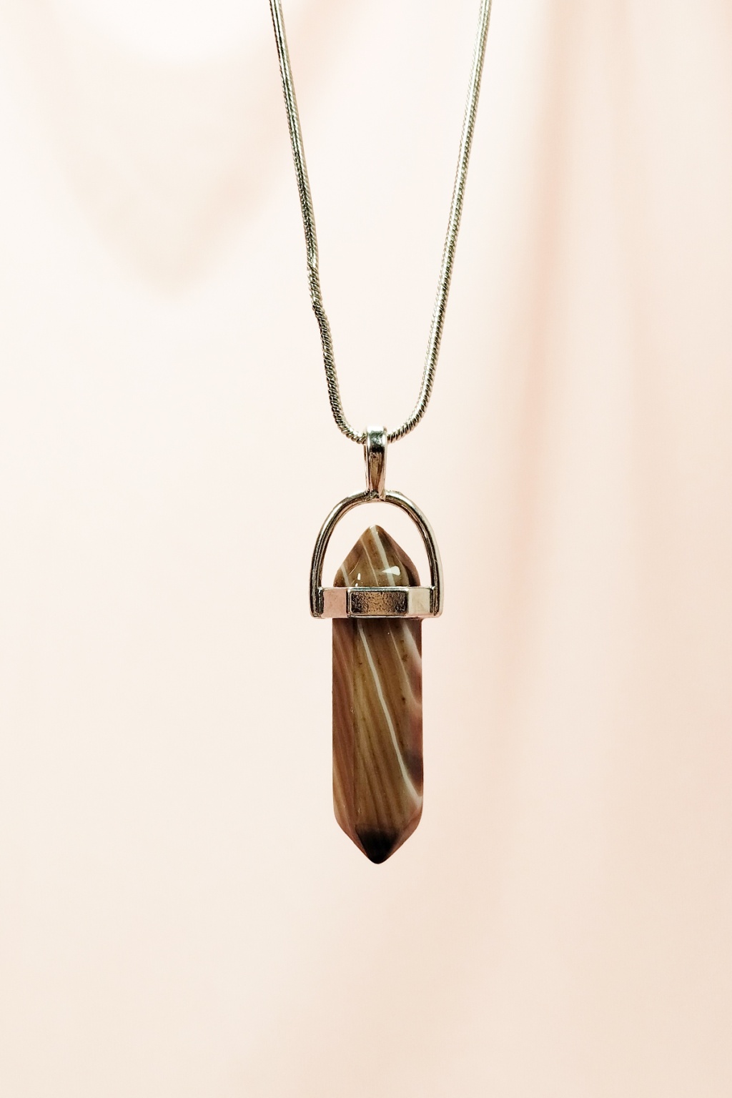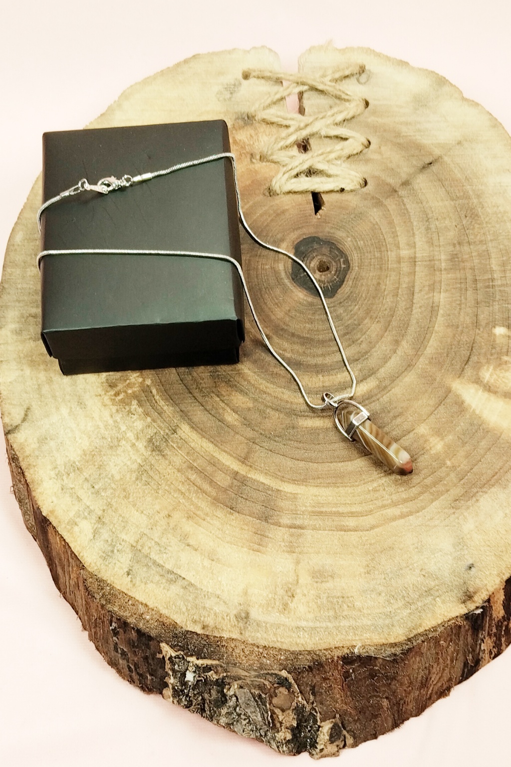 | Kahverengi Akik Doğal Taşı Zincirli El Yapımı Tasarımlı Kolye Uç: 3,5 cm Zincir: 20 cm Kutulu |