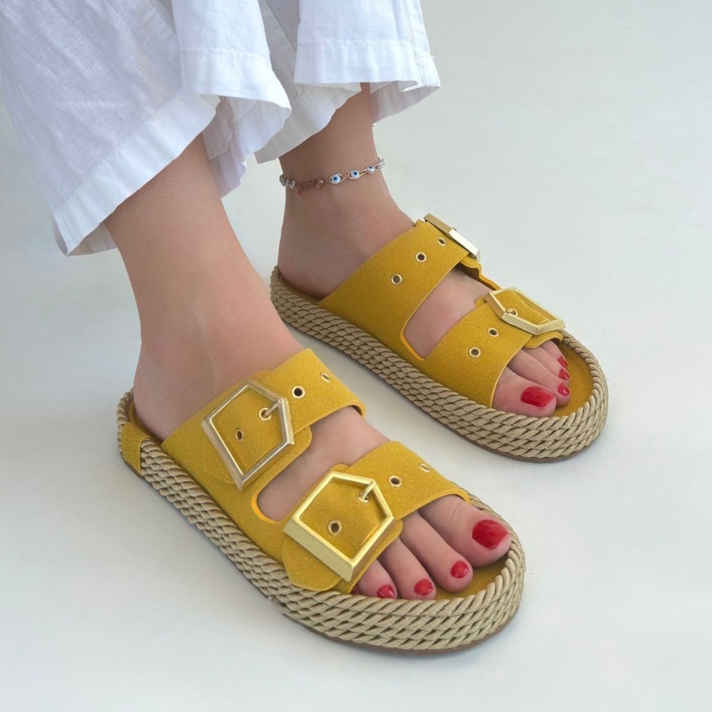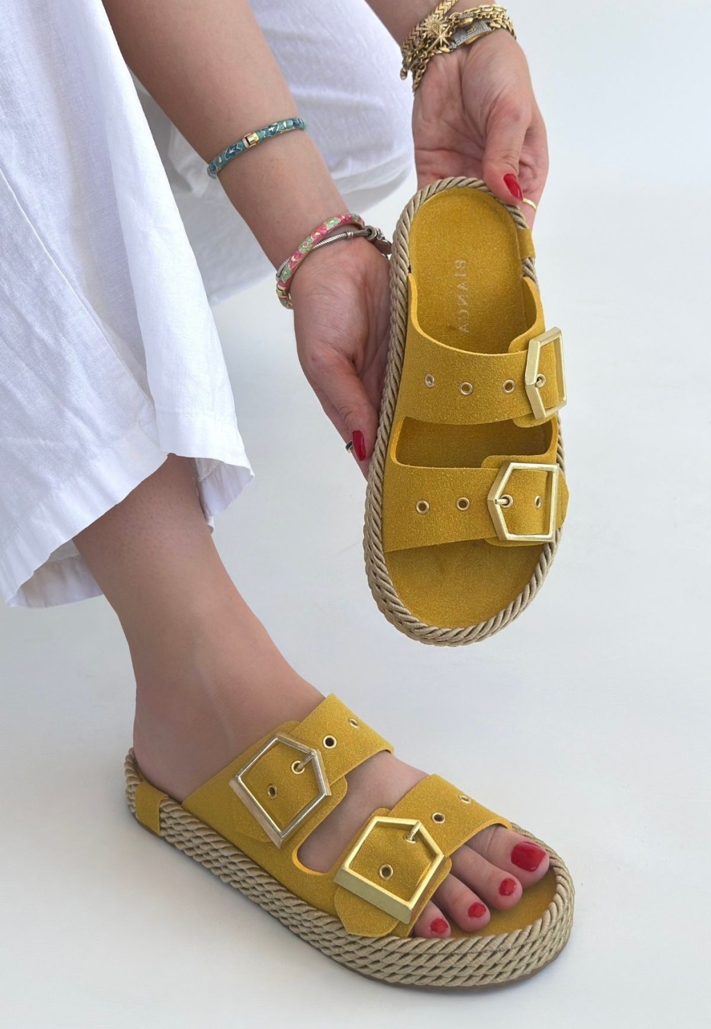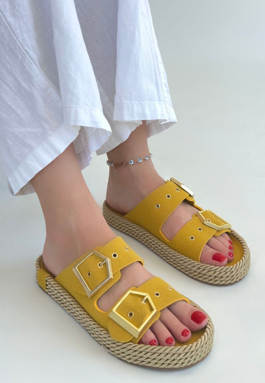 Loera Sarı Nubuk Çift Tokalı Terlik -