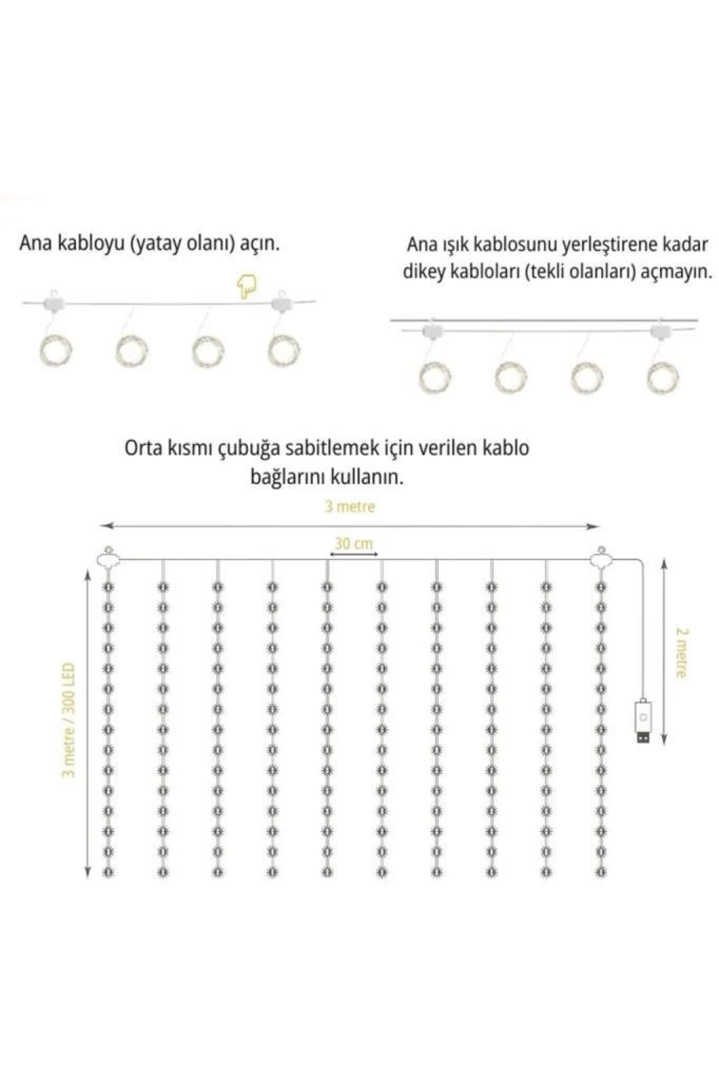 Lw-7 300 Ledli 10 Sarkıt Perde Led Işık, 8 Modlu Uzaktan Kumandalı, 3x3 Metre Peri Telli Led -