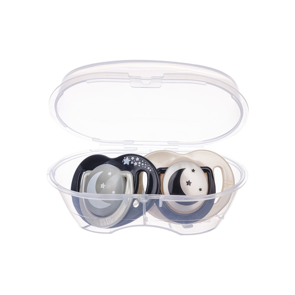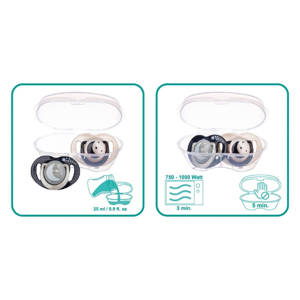 Mamajoo Sterilizasyon & Saklama Kutulu İkili Desenli Ortodontik Black & Pearl / Gece & Gündüz Emzikleri, BPA ve Fitalat içermeyen yüksek kaliteli hammaddeler ile yüksek kaliteli şeffaf, tatsız ve kokusuz silikondan üretilmiştir. Her yaş grubu için ideal yumuşaklıkta ve pürüzsüz olup kolay temizlenir.