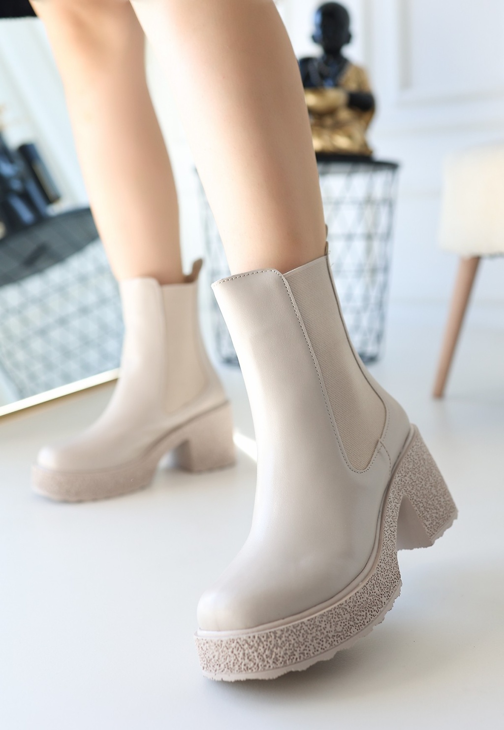 Renk: BejDetay: Topuklu Yandan Lastikli BotTopuk Boyu: 7 cm.Taban Materyali: Poli Tabanİç Materyali: Pad'li İç Taban.Kalıp: Standart Ayak Ölçülerine Göre Tam Kalıp.