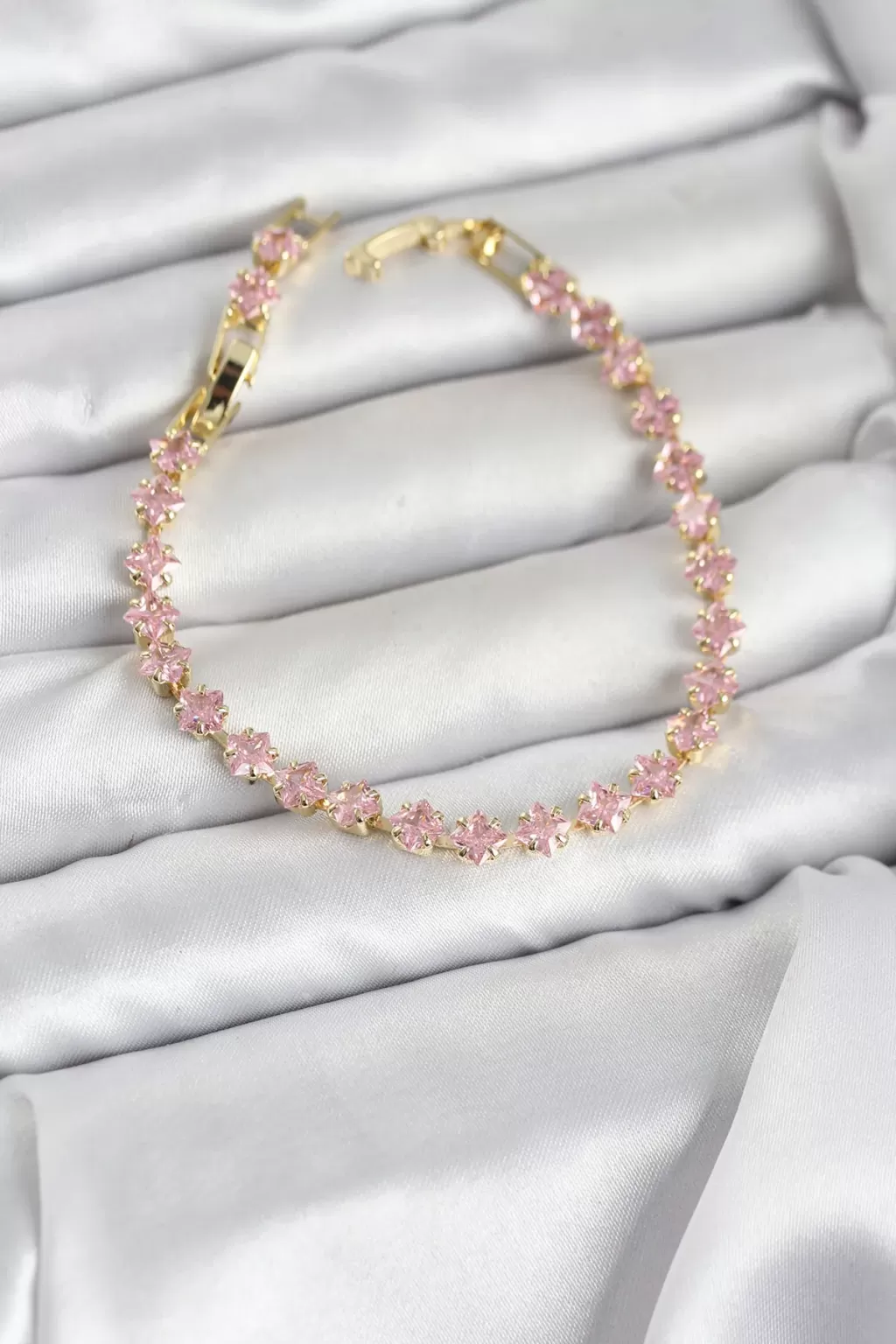Pembe Kare Zirkon Taşlı Gold Renk Pirinç Su Yolu Kadın Bileklik