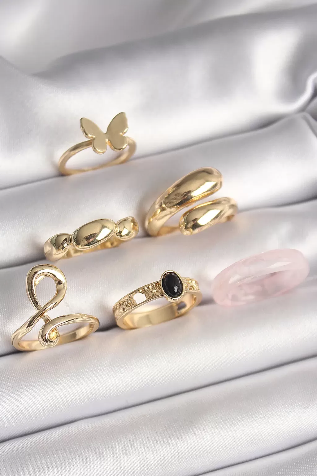 Pirinç Gold Renk Kelebek Figür Sarmal Model 6'Lı Kadın Yüzük Seti