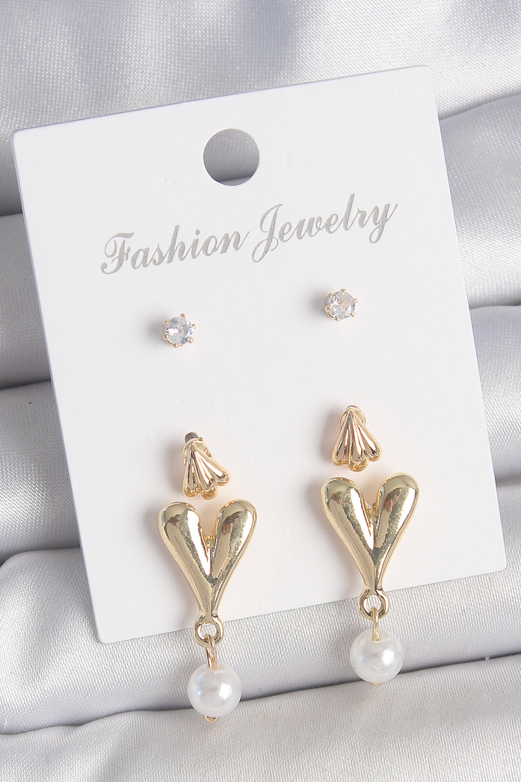 Pirinç Gold Renk Zirkon Taşlı İncili Sallantılı Kalp Model 3 Çift Kadın Küpe Seti - Lisinya