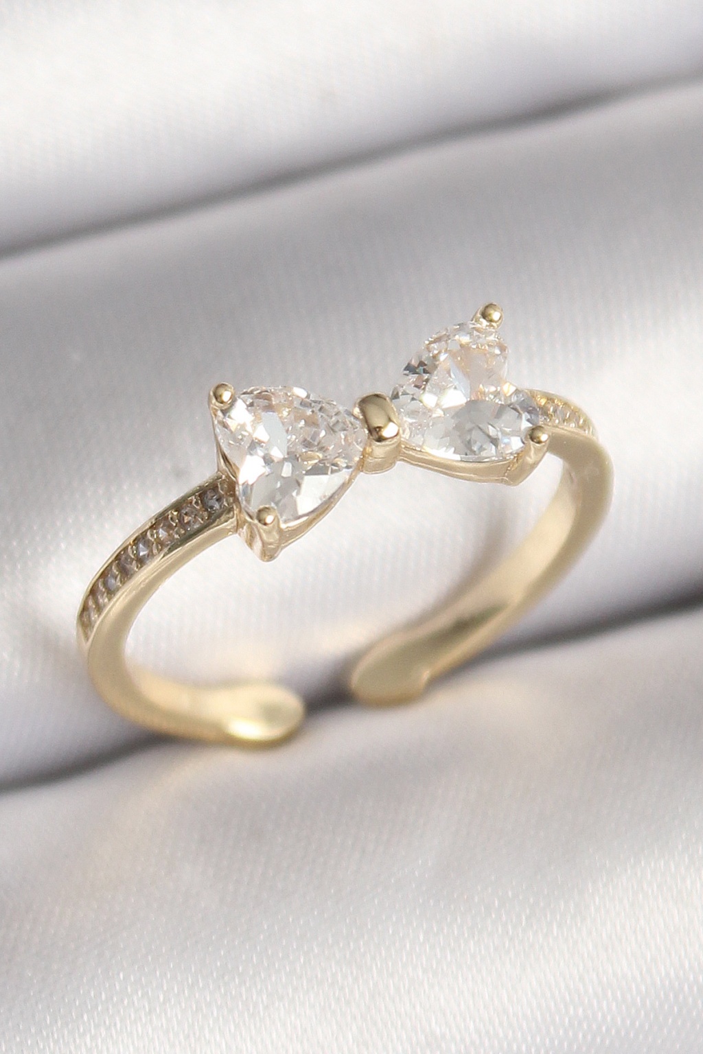 Pirinç Gold Renk Zirkon Taşlı Kalp Fiyonk Model Kadın Yüzük -