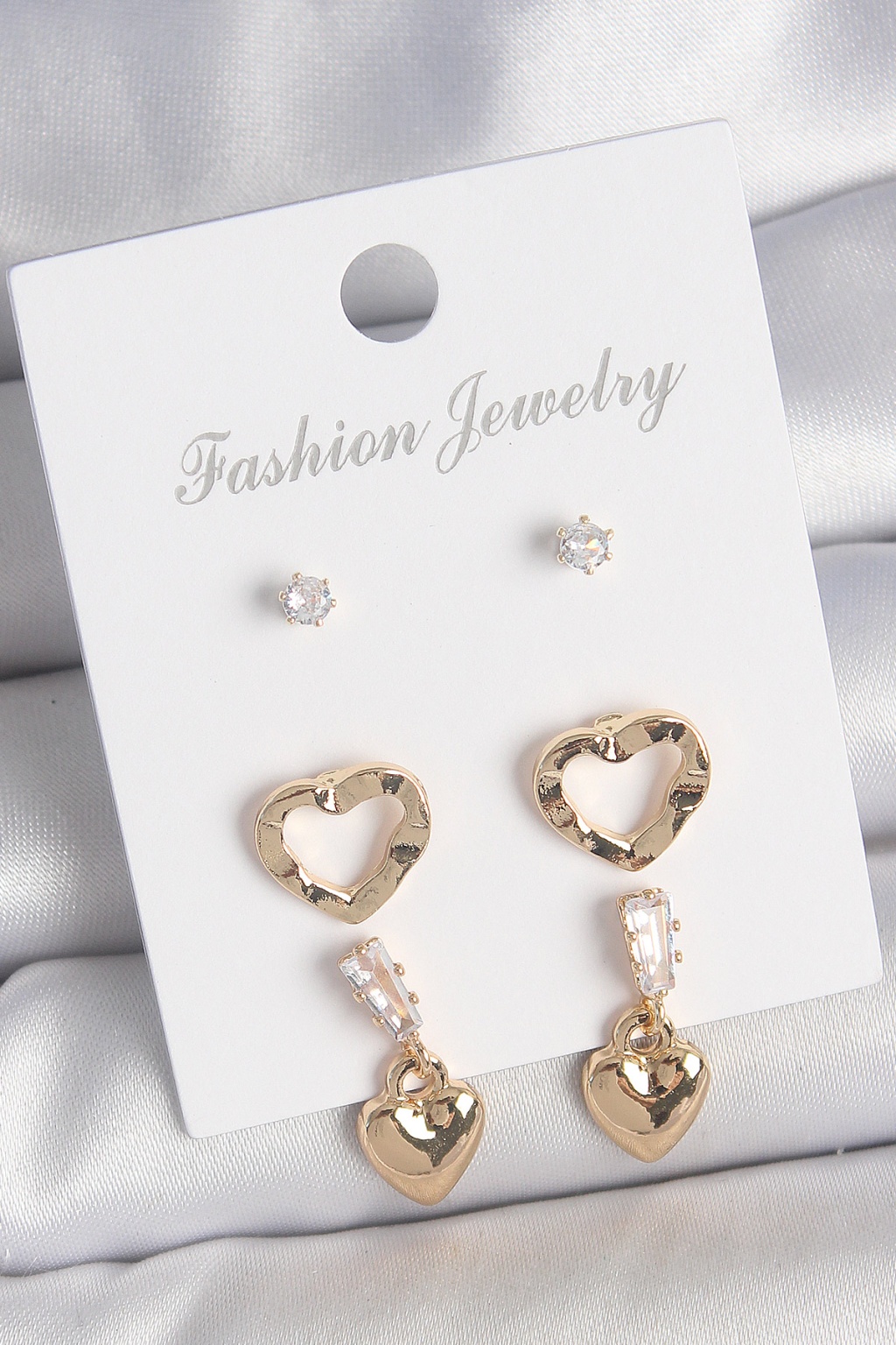 Pirinç Gold Renk Zirkon Taşlı Sallantı Kalp Model Kadın 3 Çift Küpe Seti - Lisinya