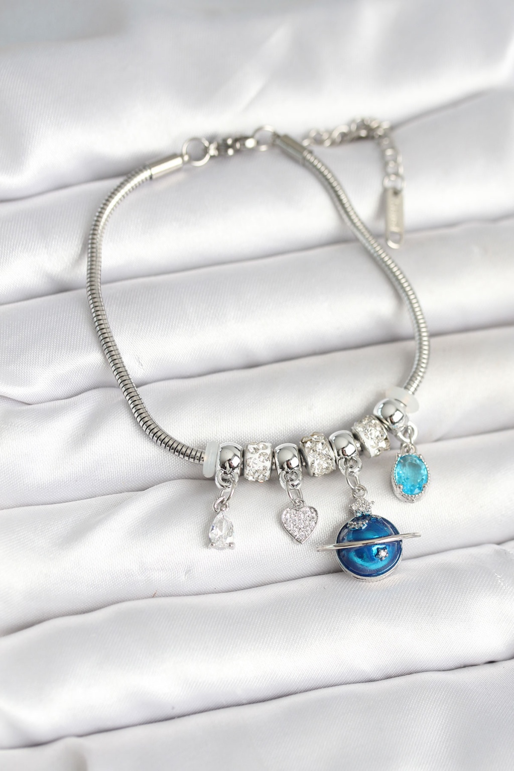 Pirinç Gümüş Renk Dünya Charmlı Kadın Bileklik - Lisinya