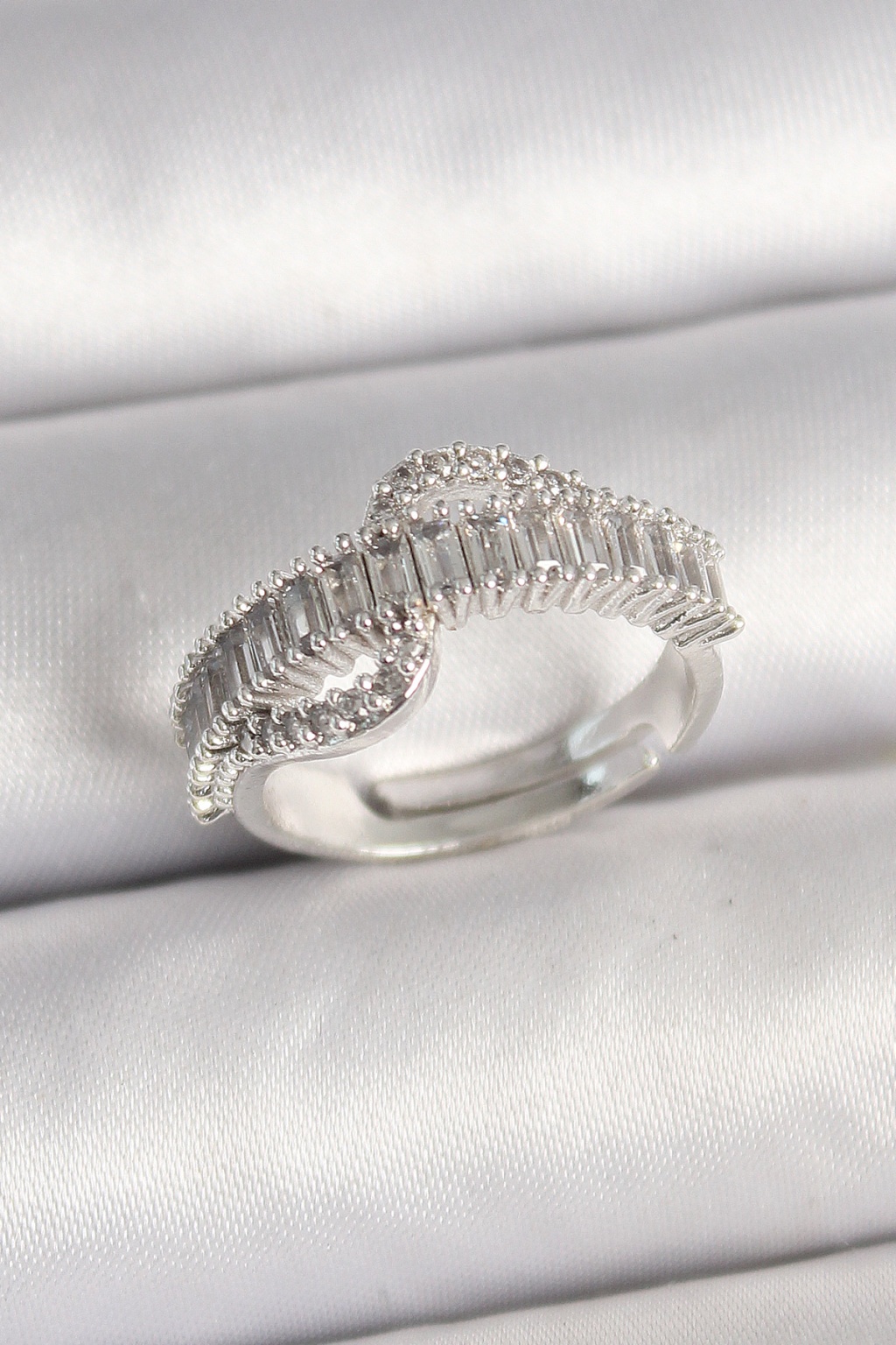 Pirinç Gümüş Renk Su Yolu Zirkon Taşlı Ayarlanabilir Model Kadın Yüzük -